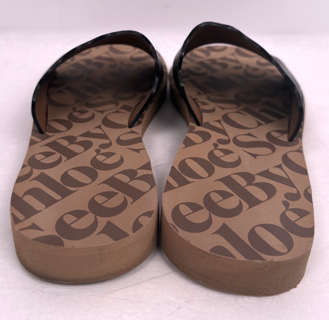 "Klapki czarne skórzane z gumową logowaną podeszwą. Rozmiar 38, pudełko w komplecie."