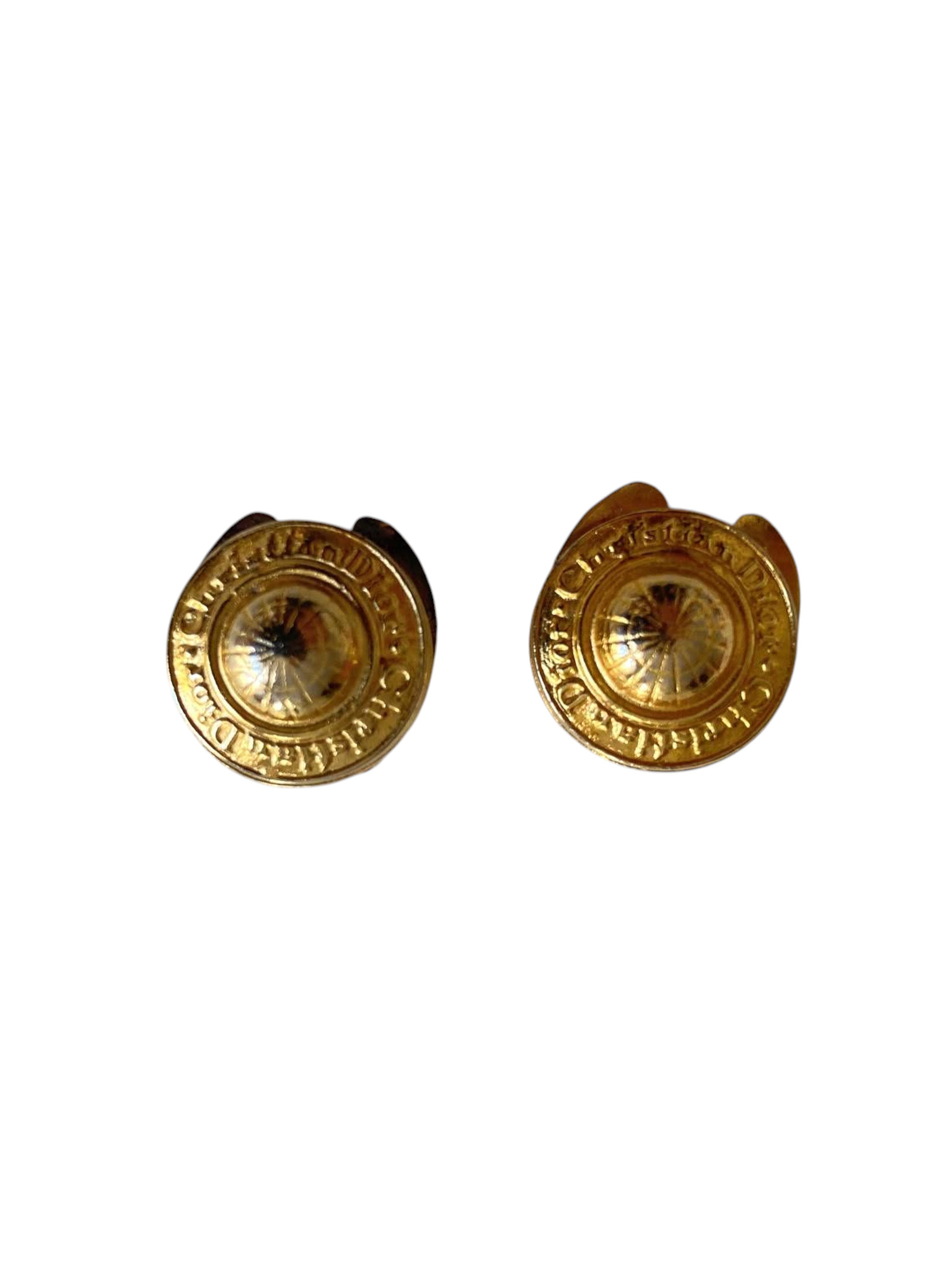 "Złote klipsy ozdobione logowaniem, okrągły kształt, w zestawie z woreczkiem. Wymiary: średnica 1,5 cm."