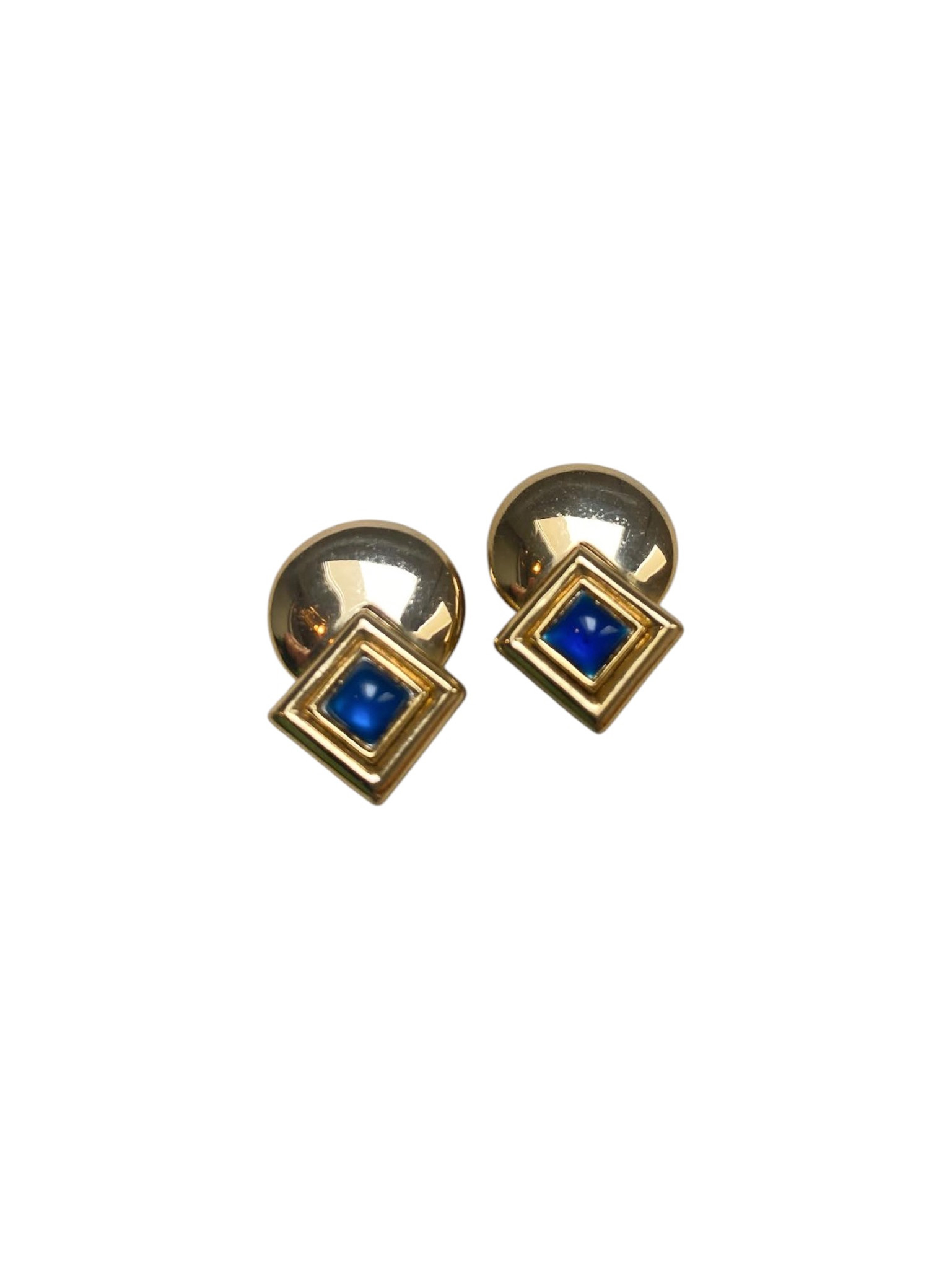 "Złote klipsy o geometrycznym kształcie ozdobione granatowym kamieniem, połyskujące, vintage. Stan dobry, posiadają rysy oraz przebarwienia. Wymiary: długość 2,5 cm, szerokość 2cm."