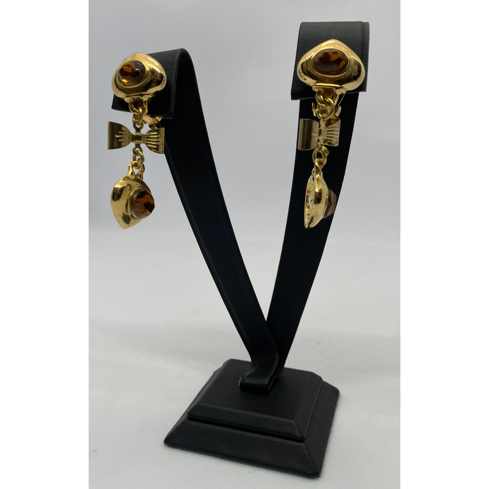 "klipsy wiszące, złote, kokardka na środku góra i dół brązowy kamień"