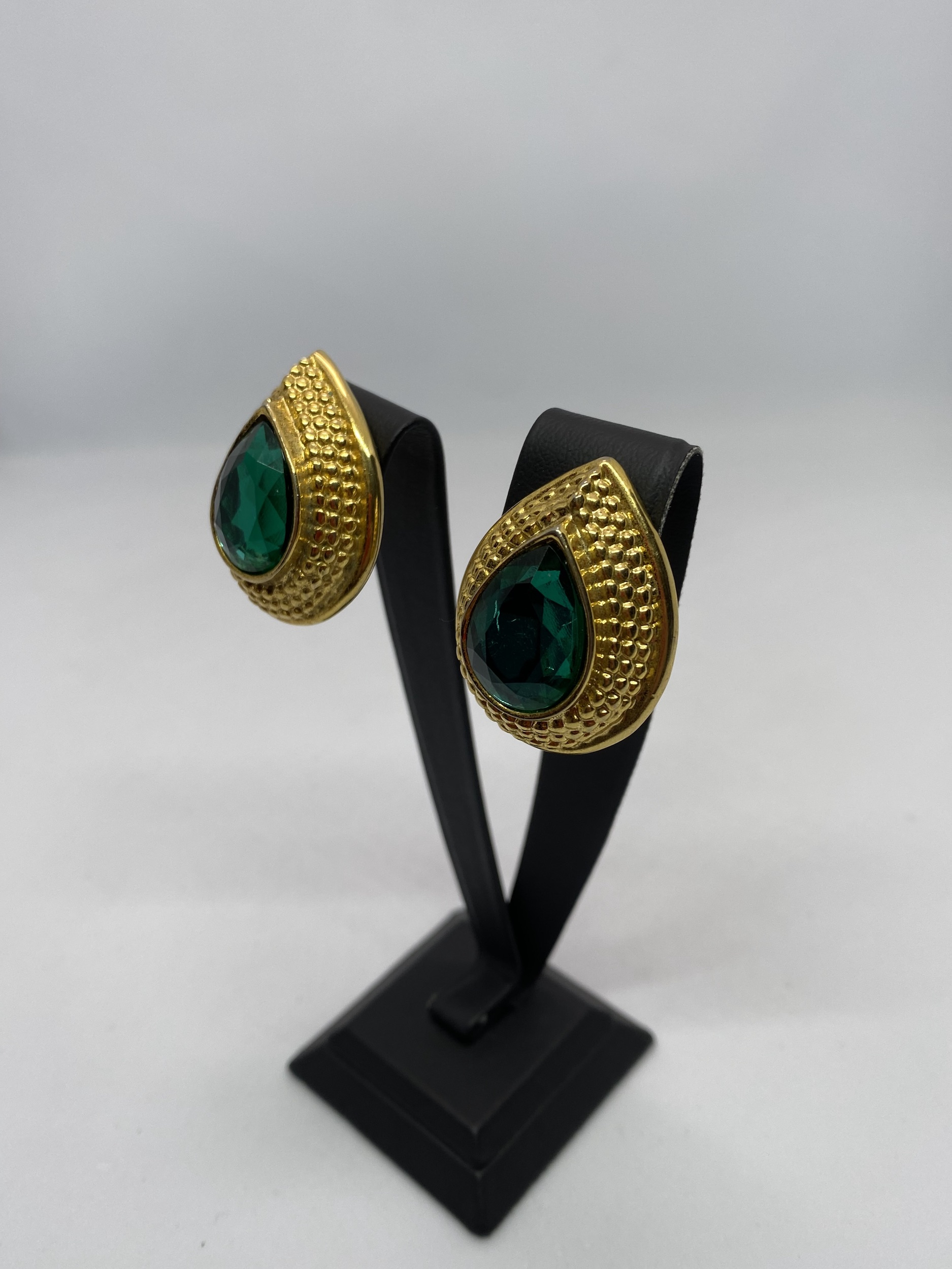 "duże klipsy złote w kształcie łezki, z środku duży zielony kamień."