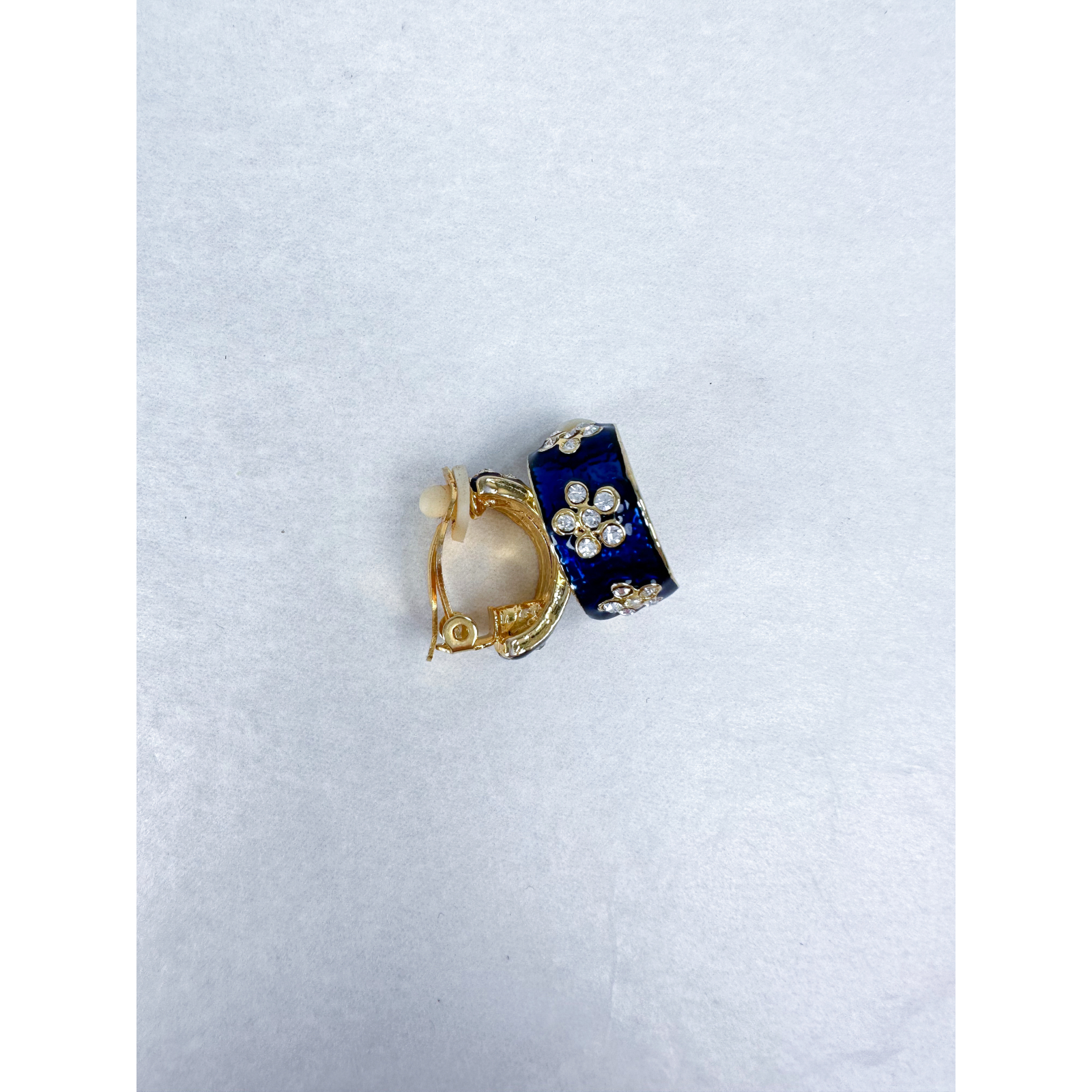 "Półokragłe klipsy w kolorze złoto granatowym ozdobione cyrkoniami w kwiatki; wielkość 2cm."