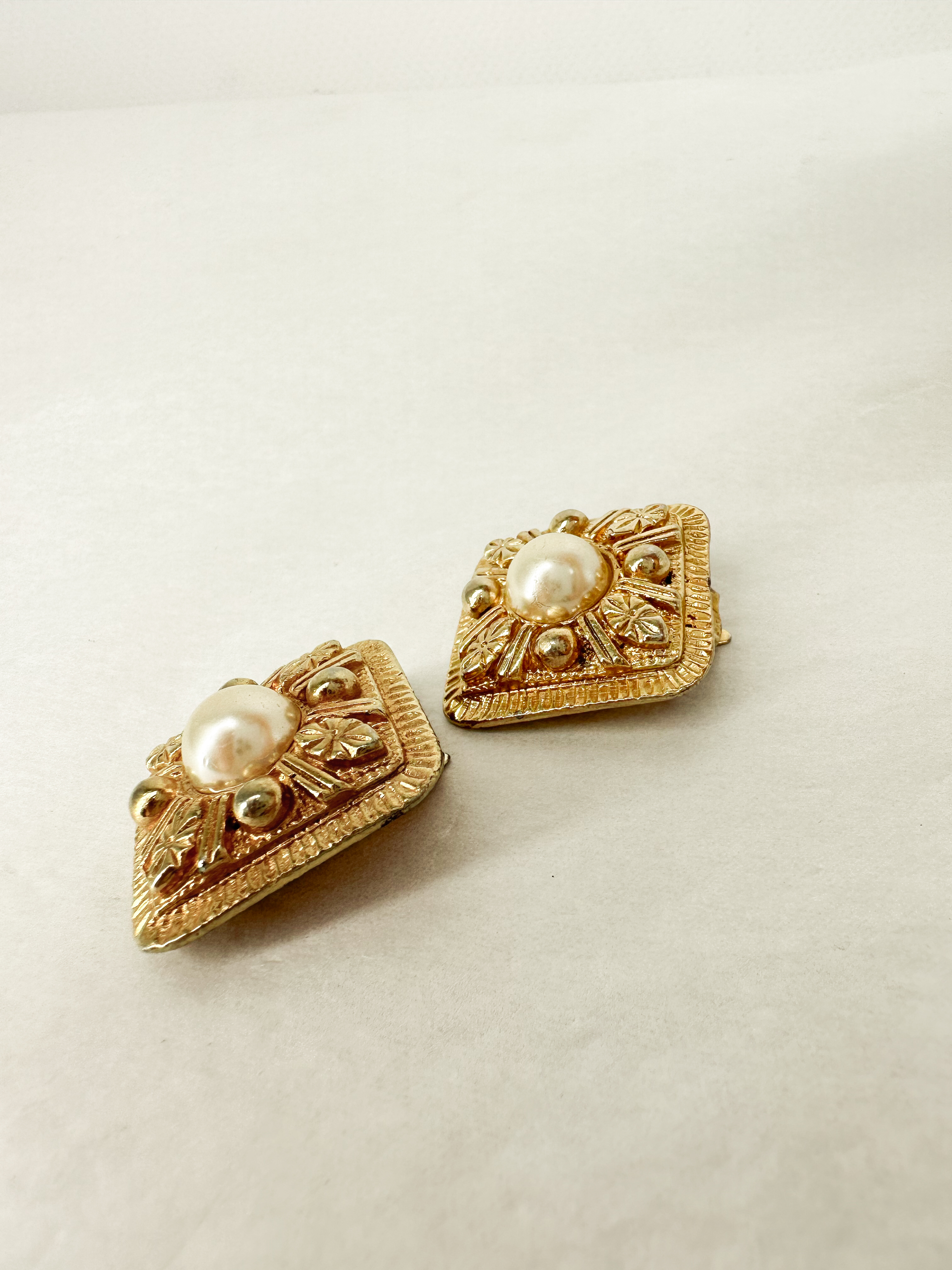 "Większe złote klipsy, forma kwadratu, środek wysadzany perłą, wysokość 2,5cm."