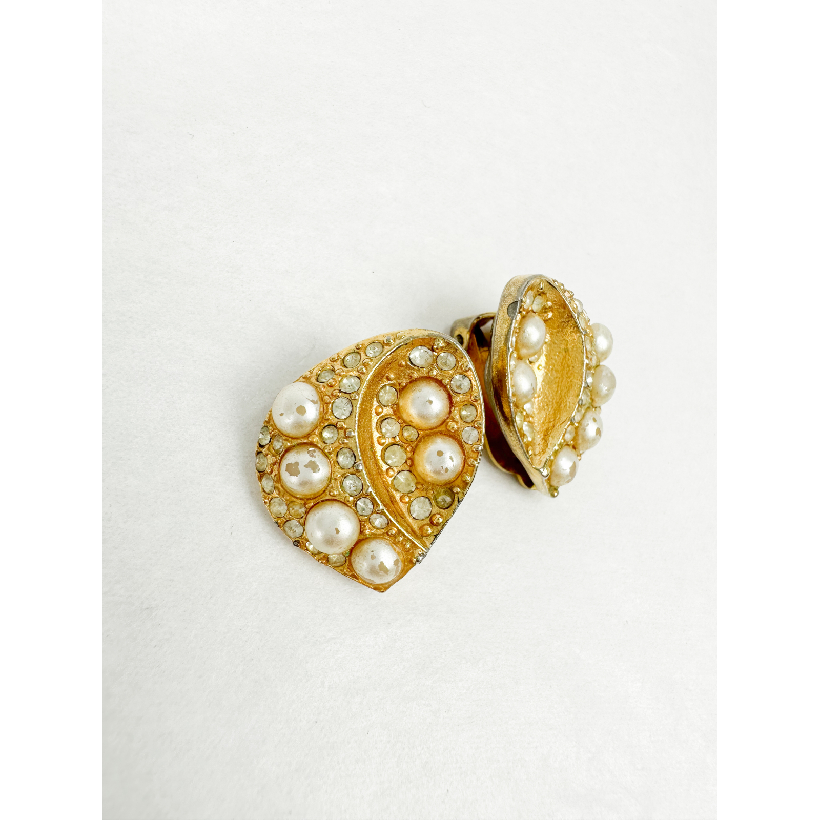 "Złote klipsy wysadzane perełkami oraz diamencikami, owalna forma liścia. Perełki są delikatnie pozdzierane; wysokość 2,5cm."