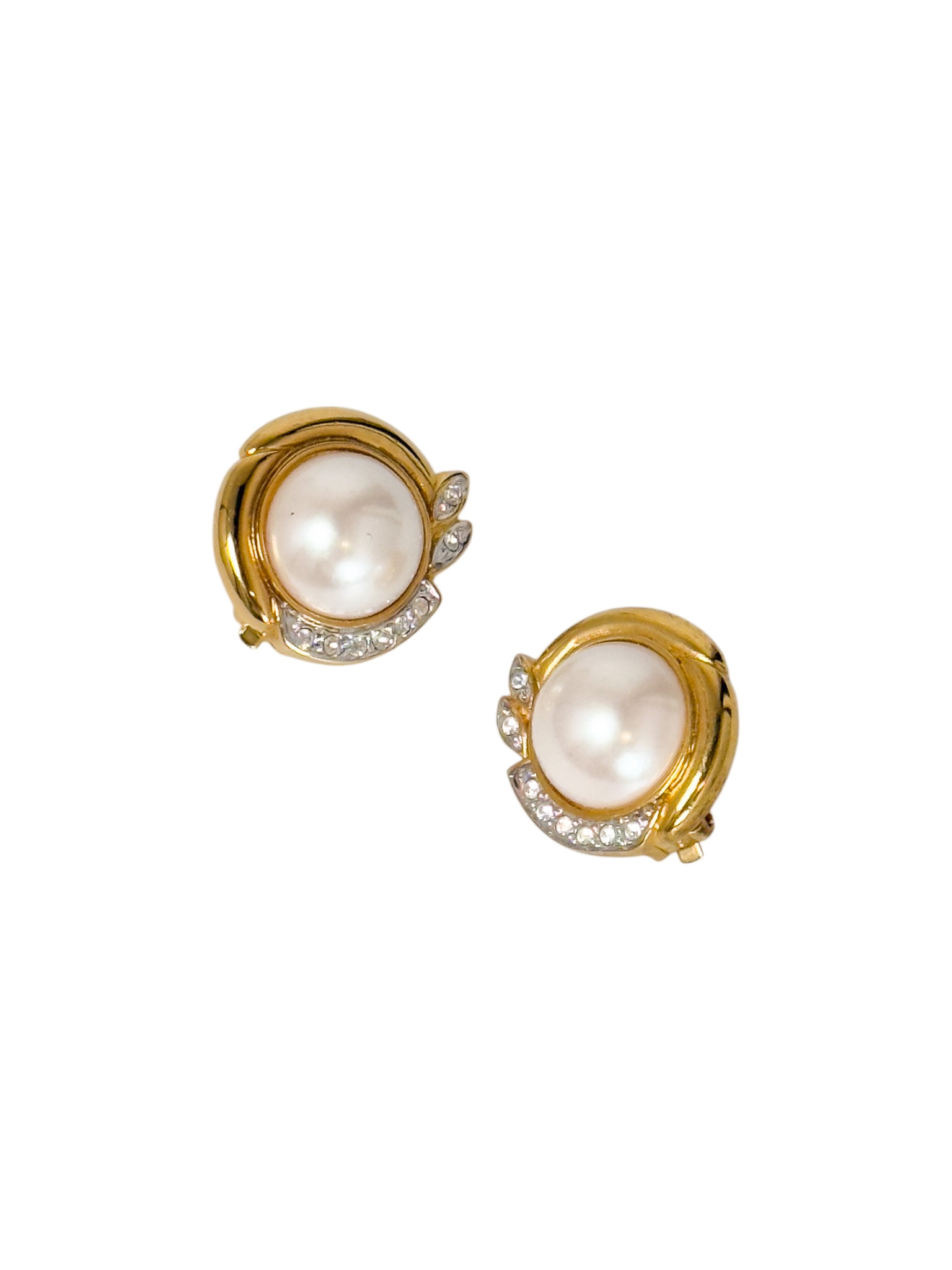 "Złote klipsy ozdobione perłą, okrągłe, duże, wykończone gałązką oliwną wysadzaną srebrnymi błyszczącymi cyrkoniami."