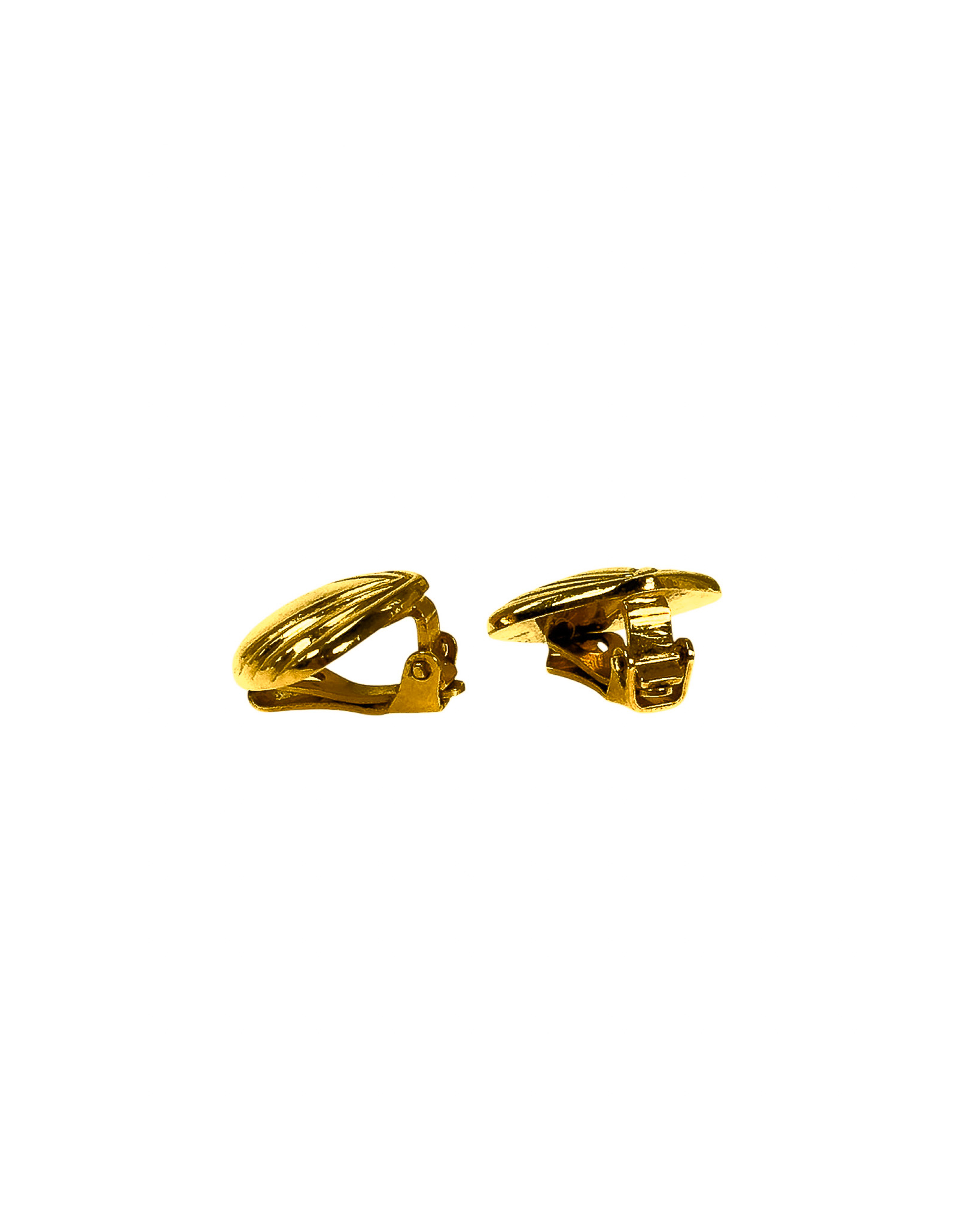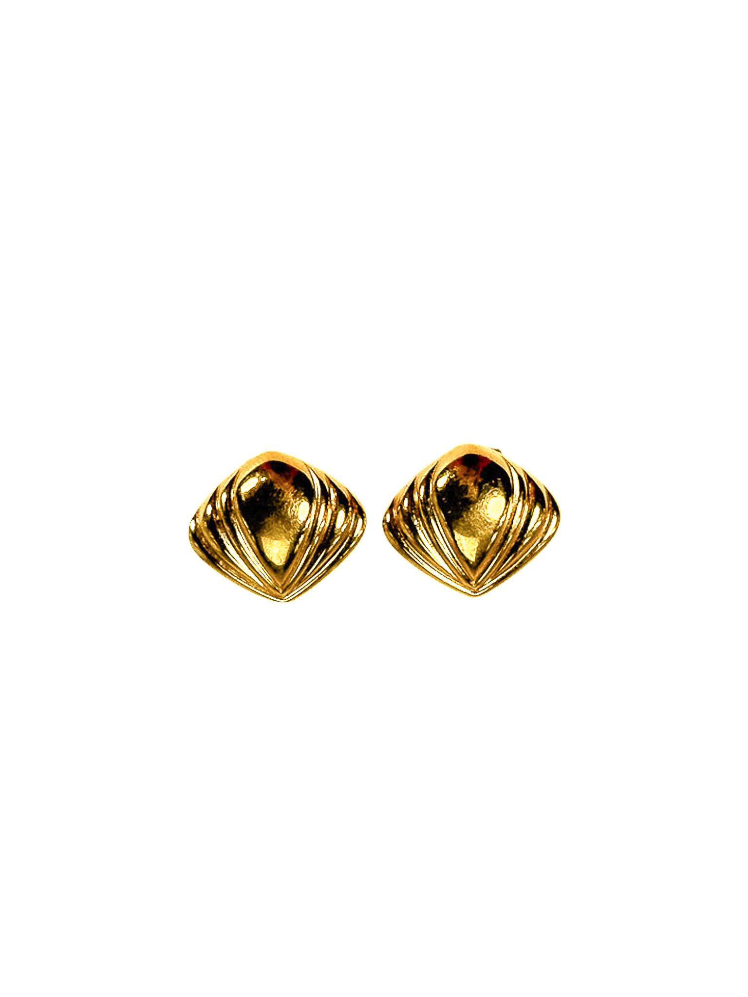 "Złote klipsy w kształcie rombu, małe, logo marki od wewnętrznej strony. Stan bardzo dobry, posiadają delikatne rysy."
