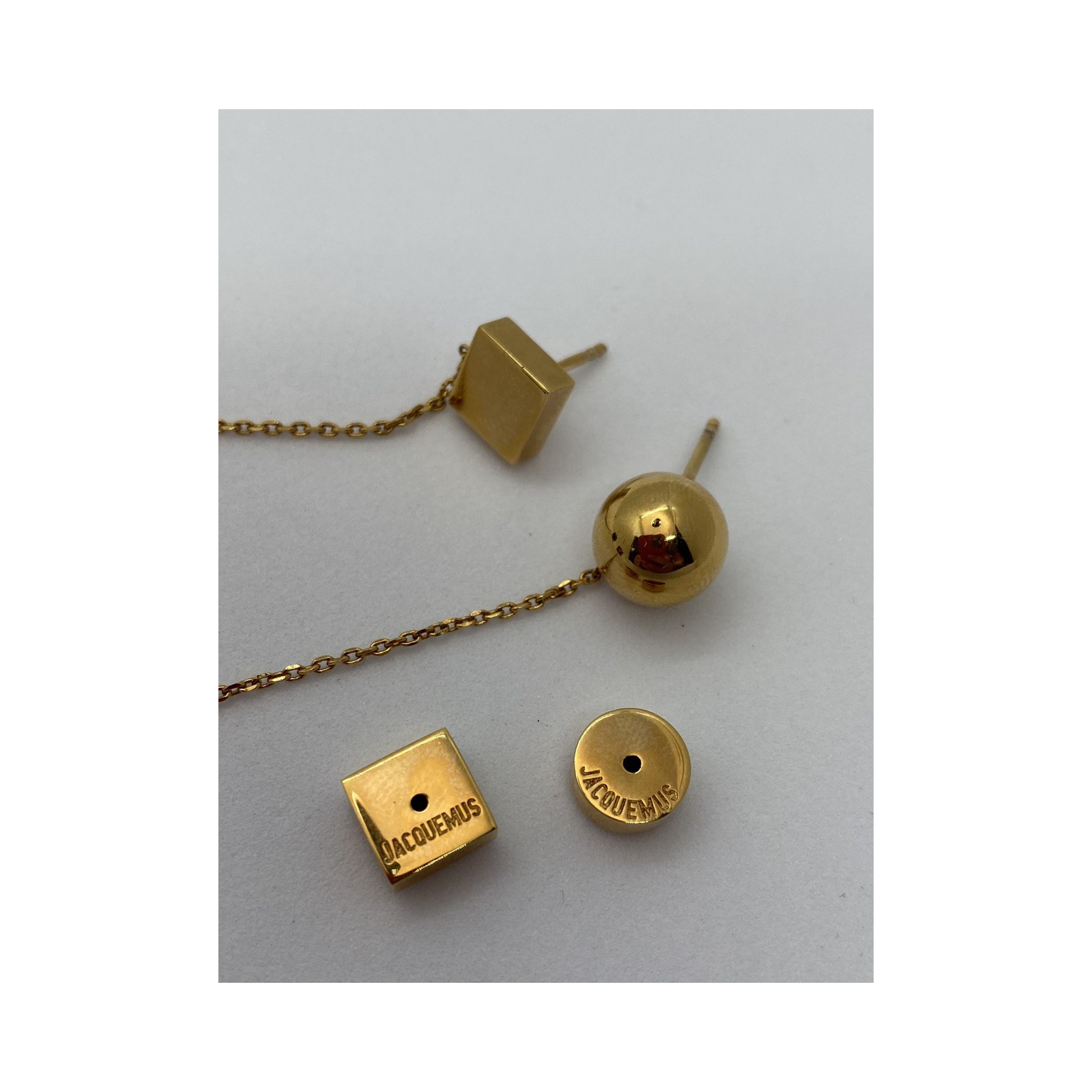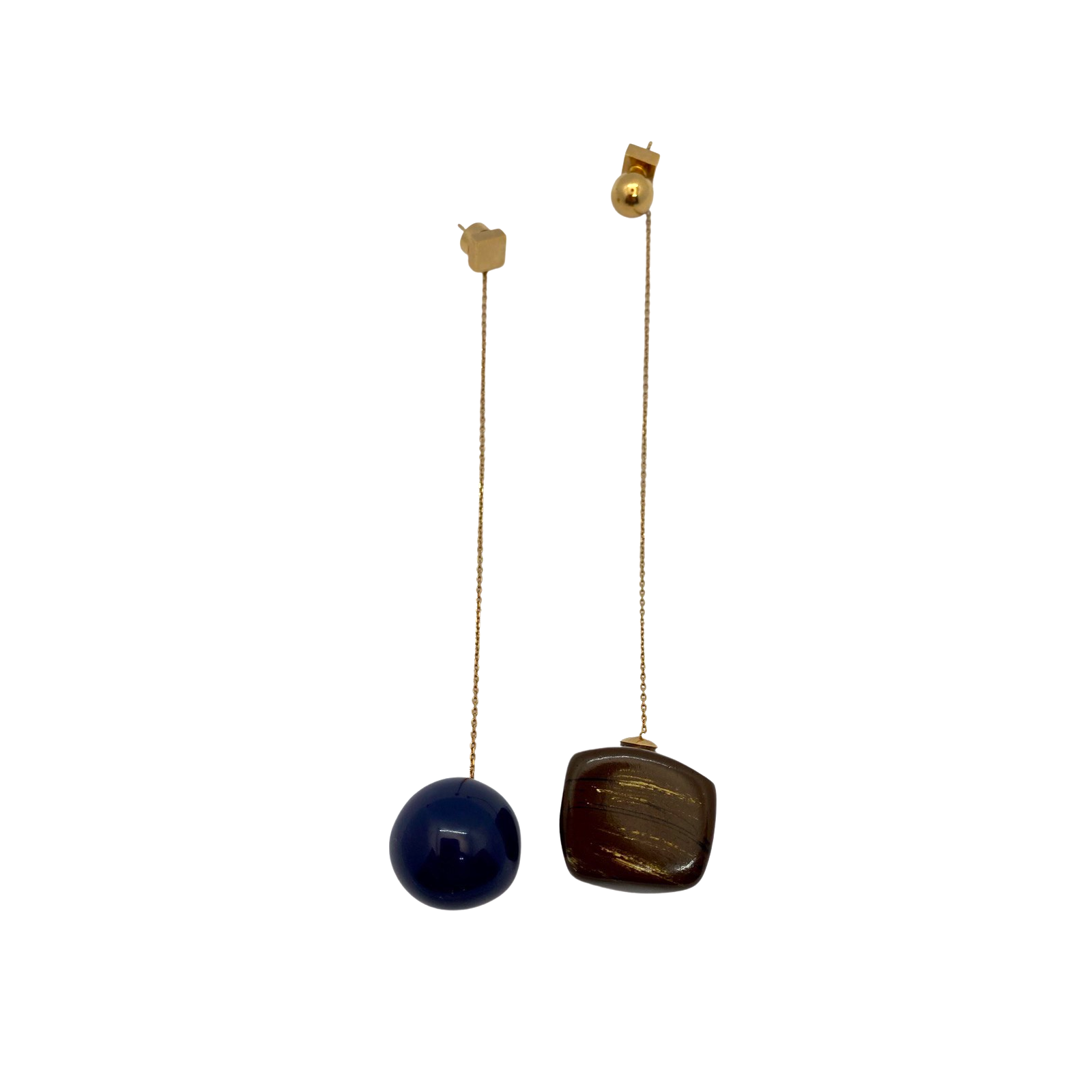 "długie, wiszące kolczyki, złoty cienki łańcuszek, jeden zakończony granatowa kólką, drugi brązowy kwadrat"