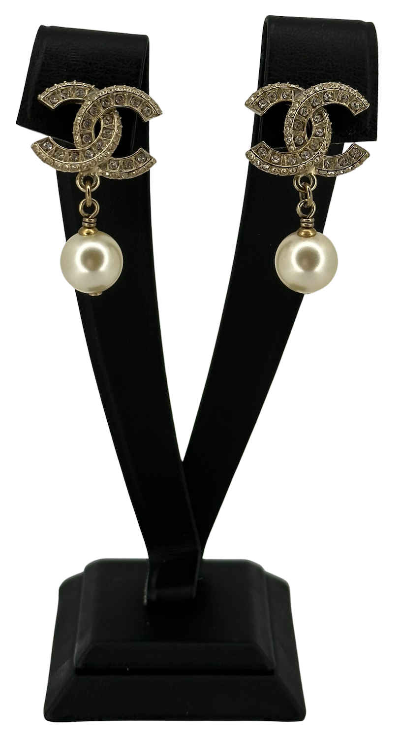 "kolczyki (wkręty) wiszące z perłą oraz z logo wysadzanym cyrkoniami, pudełko"