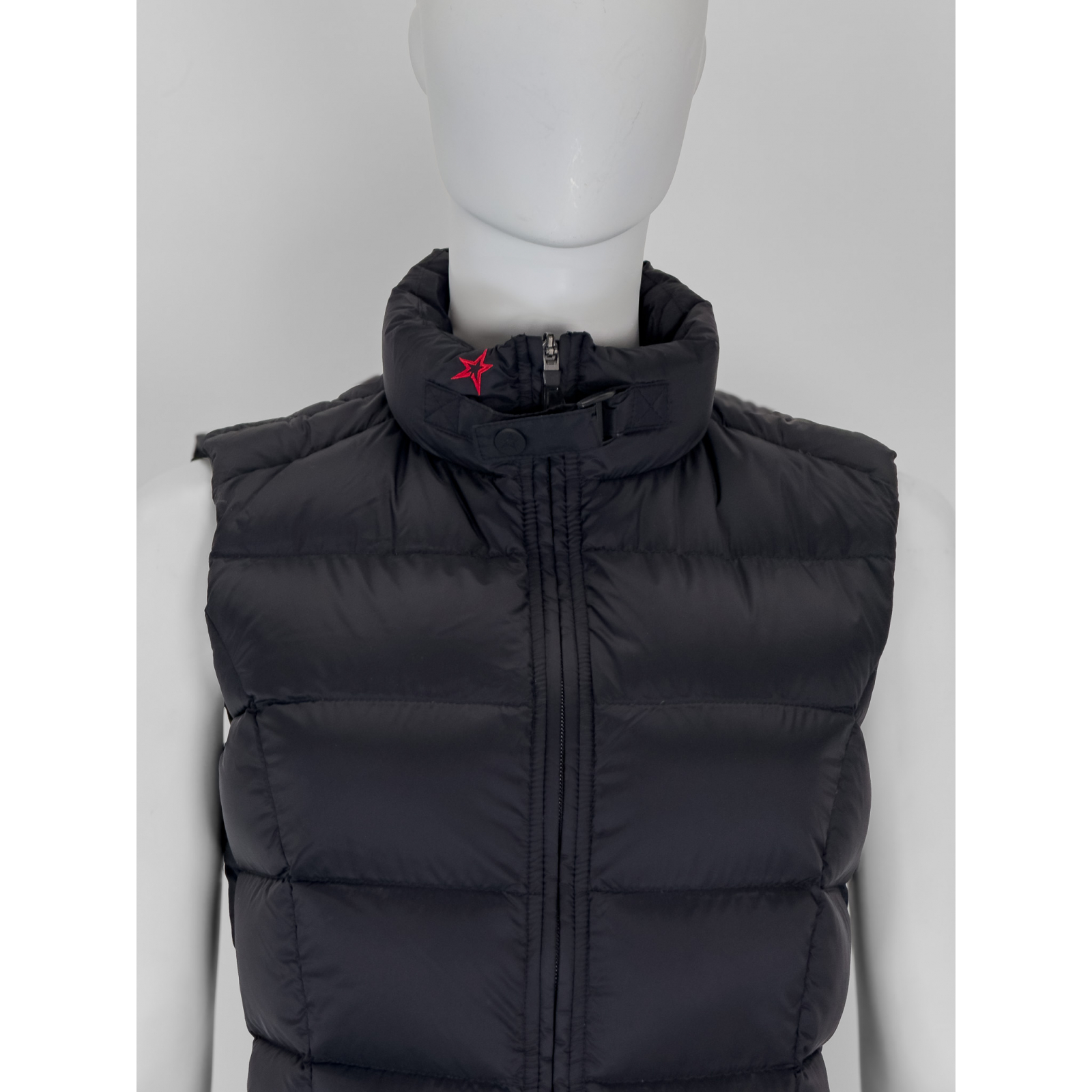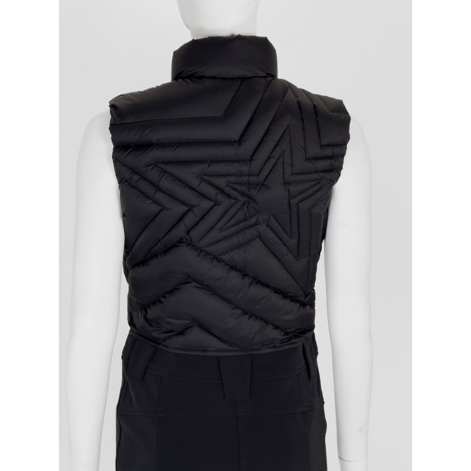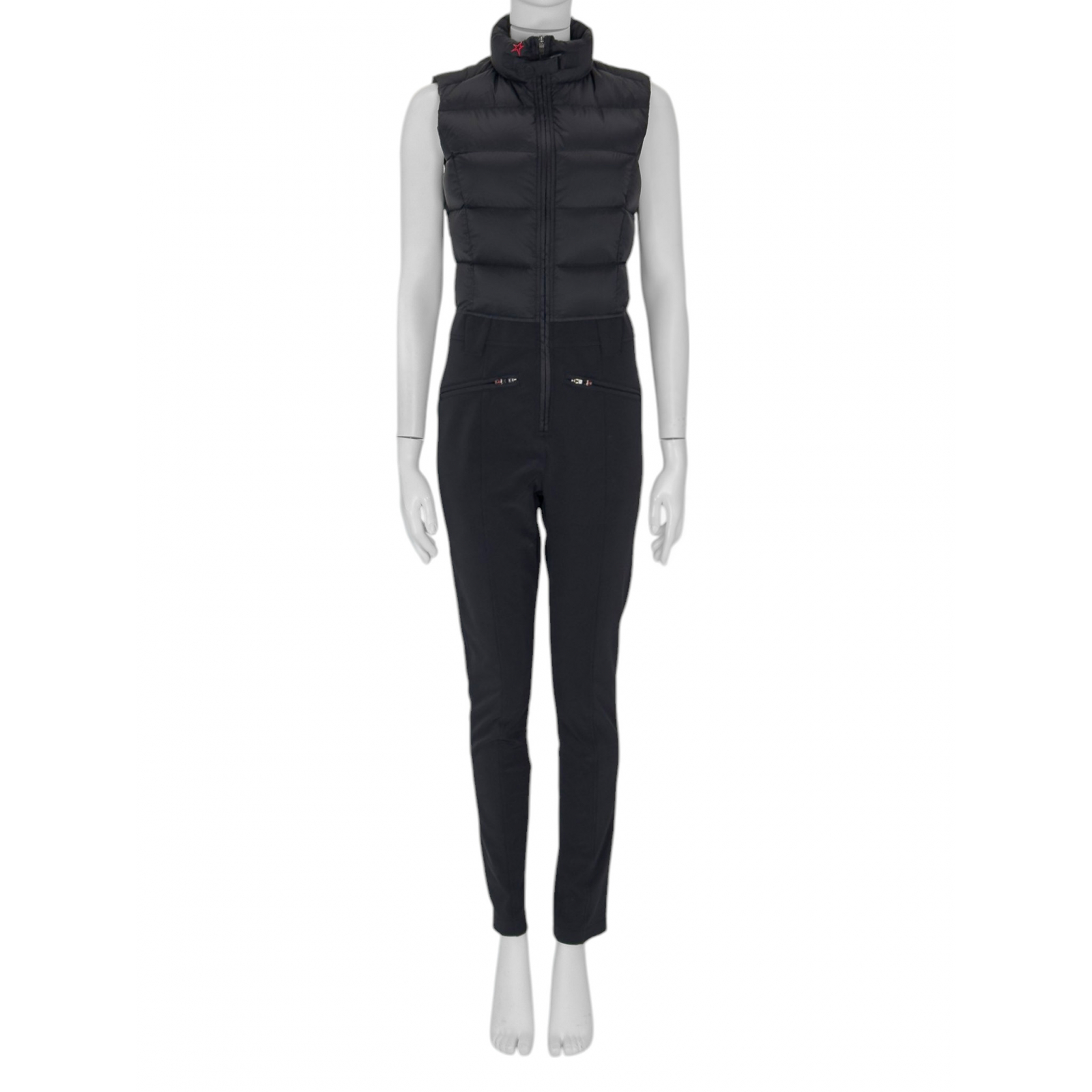 "Czarny kombinezon bez rękawów wykonany z łączonych materiałów, pikowany, puchowy w górnej części, stójka ozdobiona grafiką czerwonej gwiazdy, zapinany na przodzie na suwak oraz pasek w okolicy szyi, dwie zasuwane kieszenie, szlufki w pasie, nogawki wykończone przeszyciami. Rozmiar z metki S. Skład: tkanina 1-100% nylon; tkanina 2- 89% nylon, 11% poliuretan; podszewka w górnej części 100% nylon; podszewka: 90% gęsi puch, 10% pióra. Wymiary: szerokość mierzona od pachy do pachy 46cm, szerokość w talii 40cm, długość całkowita 148cm."