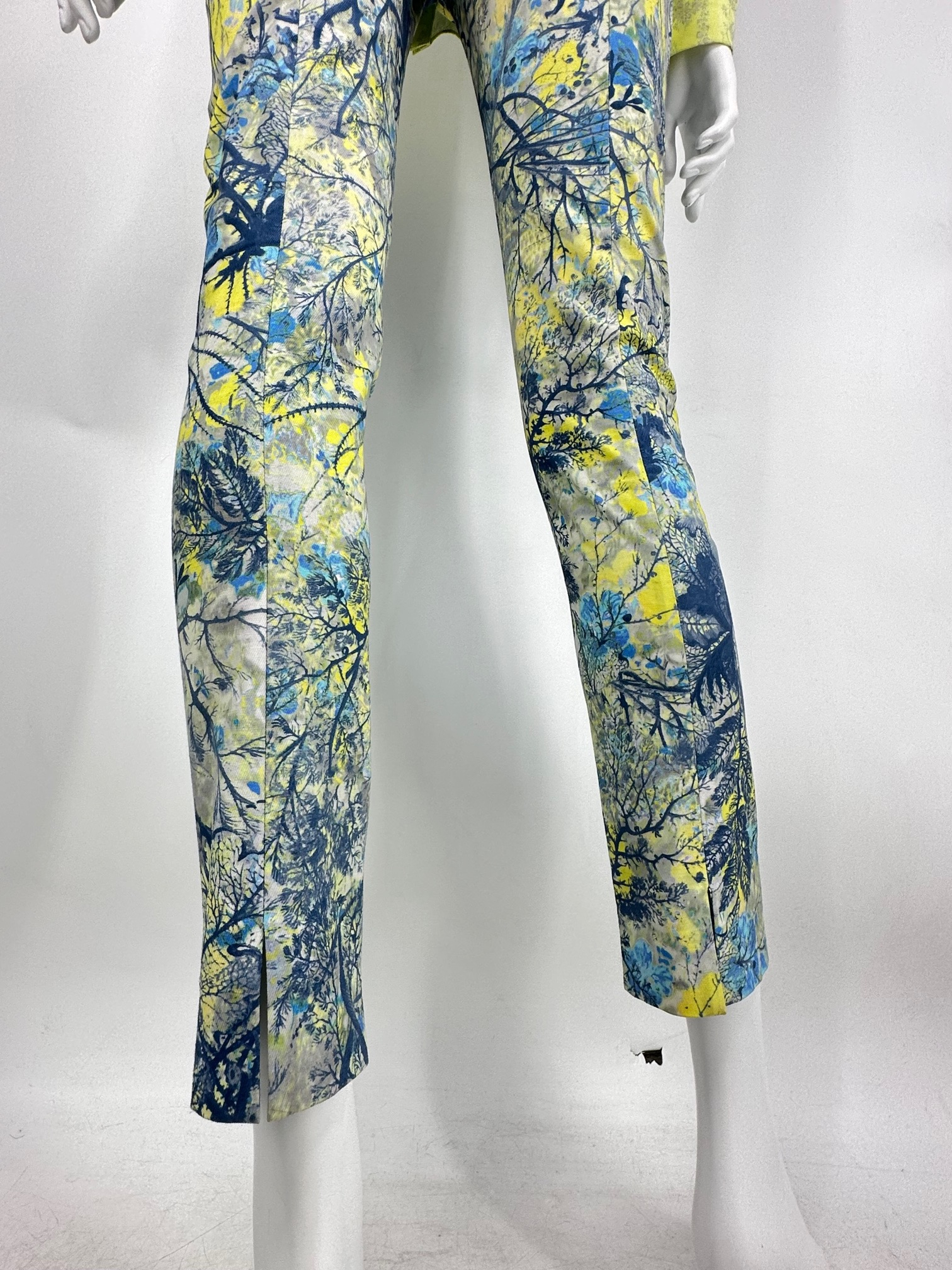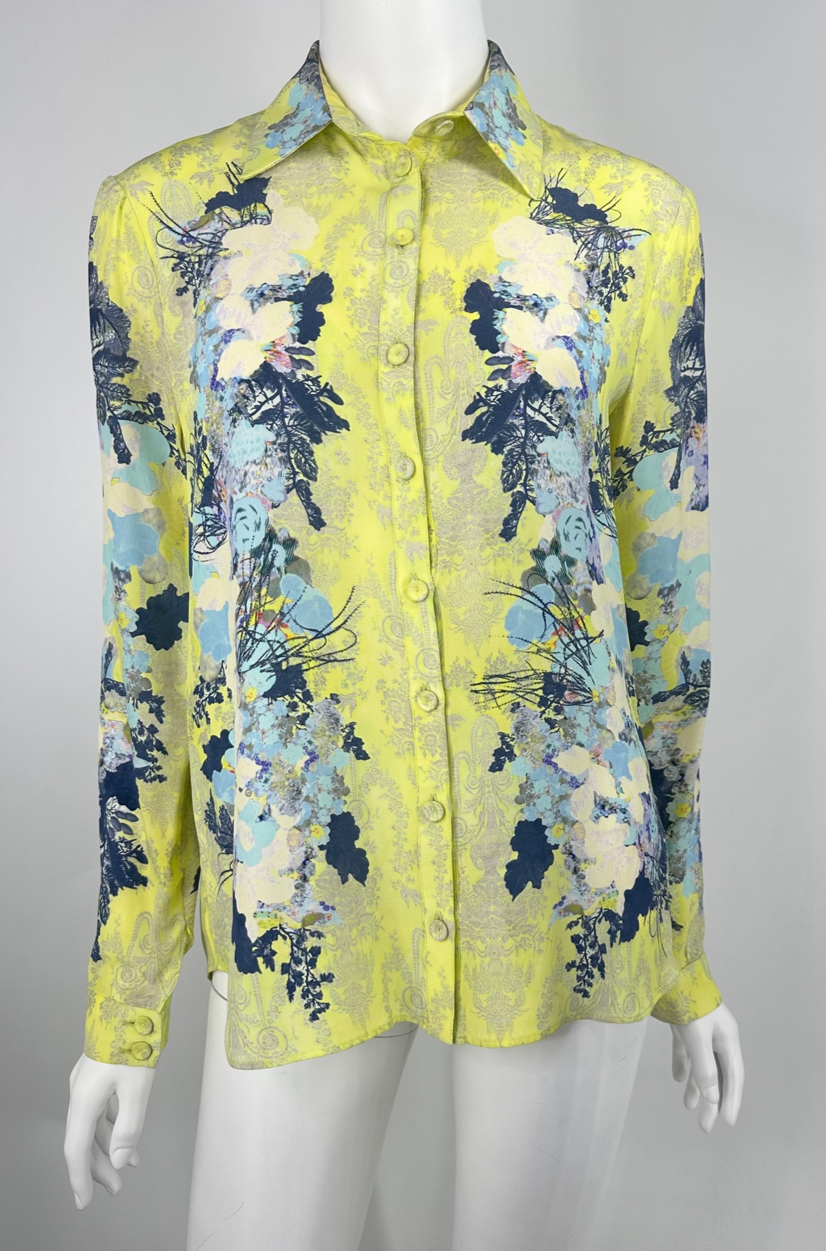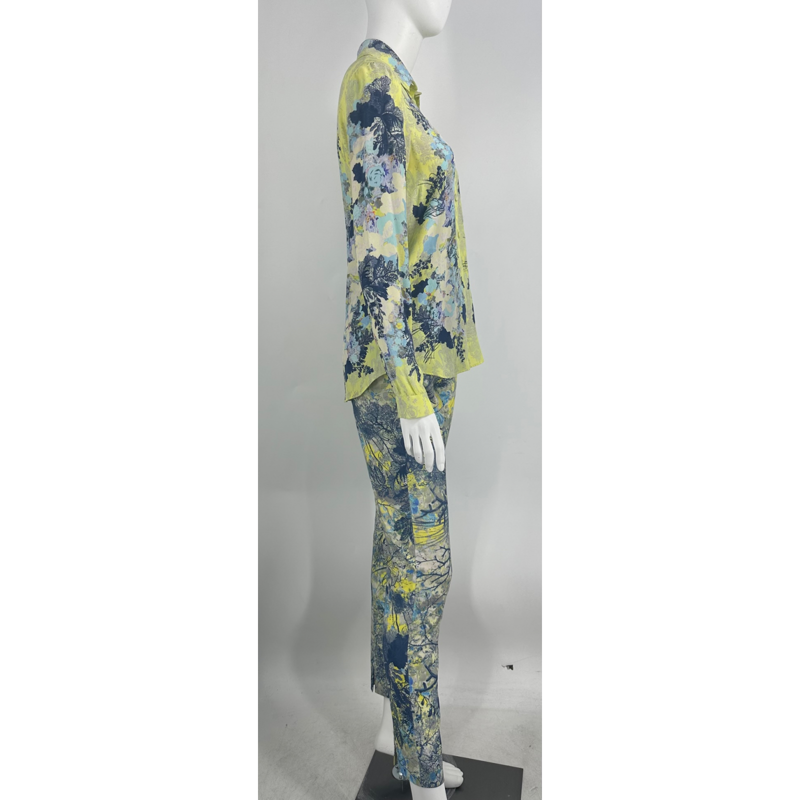 "komplet spodnie i koszula, koszula jedwabna: limonkowa w kwiaty, kołnierzyk, rozmiar z metki UK8, skład: 100% jedwab, spodnie: niebiesko/limonkowe w kwiaty, metalowe zapięcie, rozmiar UK8, skład: 50% wiskoza, 47% bawełna, 3% elastan. Wymiary: koszula szer. ramion 41 cm, szer. biustu 45 cm, szer. talii 46 cm, dł. całkowita 63 cm, dł. rękawa 58 cm, spodnie: szer. talii 37 cm, szer. bioder 42 cm, dł. całkowita 95 cm."