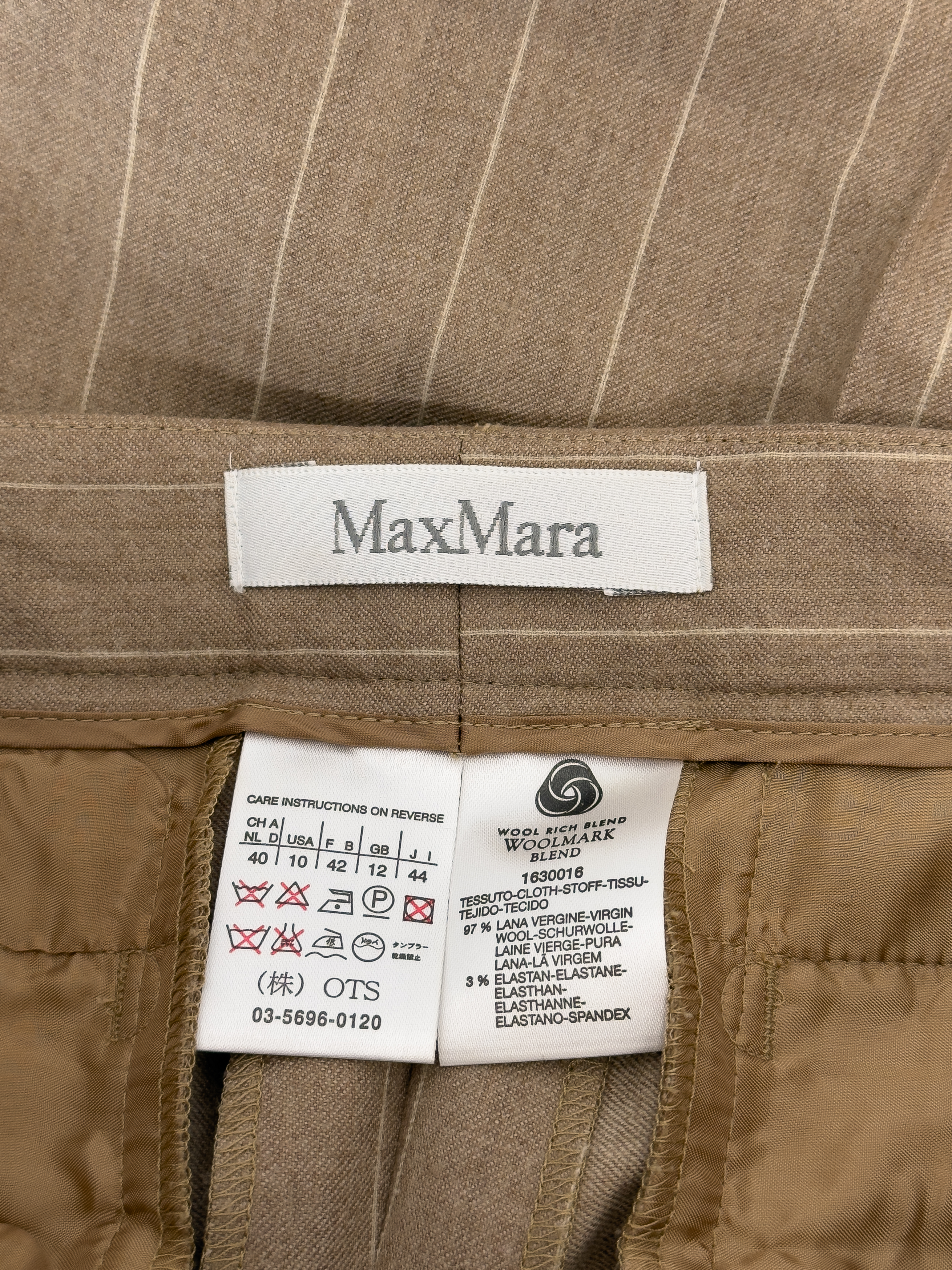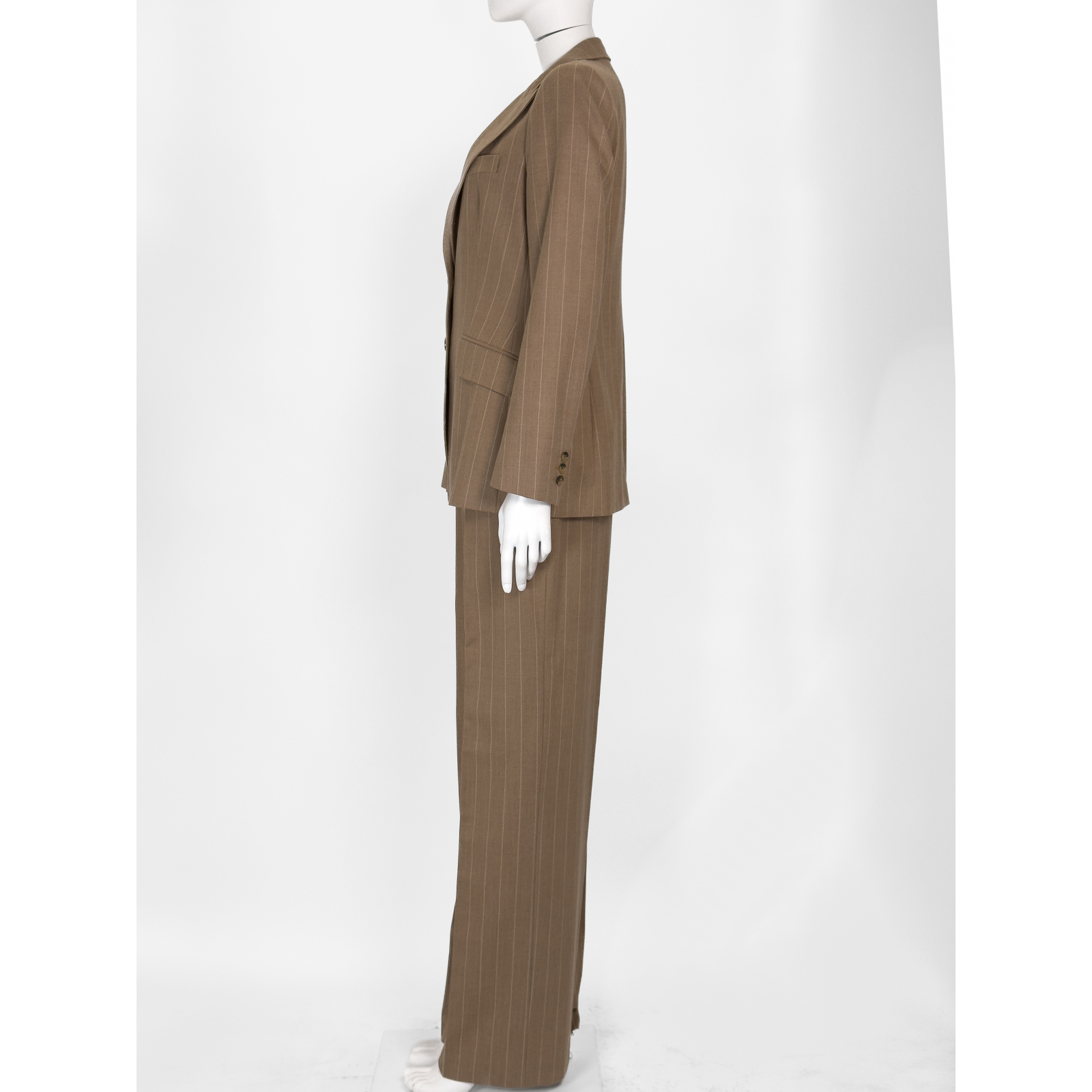 "Wełniany komplet garniturowy w prążek, marynarka i spodnie w odcieniach beżu. Marynarka zapinana na brązowe guziki, taliowana. Rozmiar z metki IT 44. Skład: 97% wełna, 3 % elastan. Wymiary marynarki: szerokość mierzona od pachy do pachy 48cm, szerokość w talii 43cm, długość całkowita 72cm; wyiary spodni: szerokość w pasie 40cm, długosć całkowita 112cm."