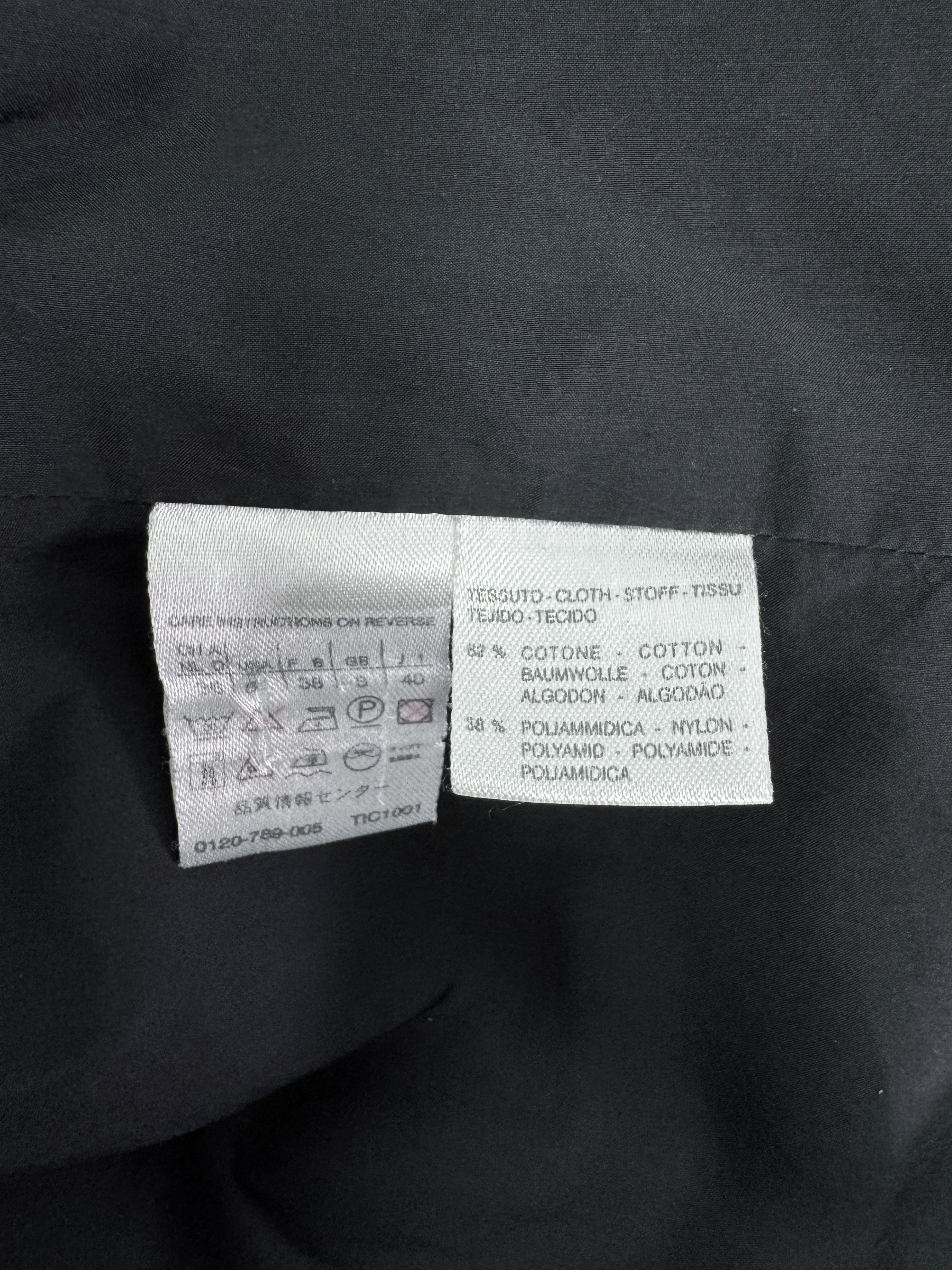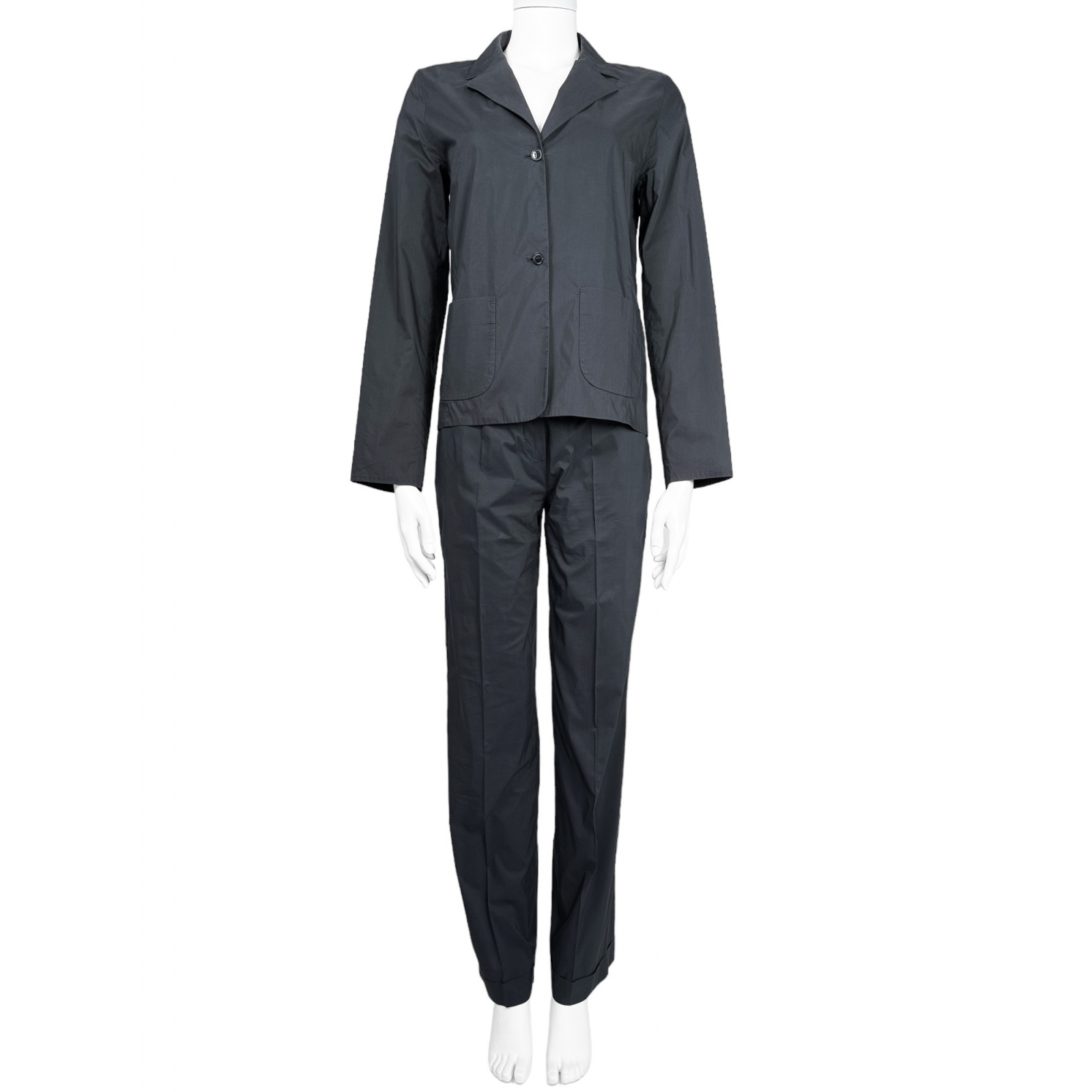 "Ciemnogranatowy bawełniany komplet koszula o kroju żakietu+ spodnie; Koszula zapinana na dwa logowane guziki, dwie kieszenie w przedniej części, dekolt w szpic, kołnierzyk, długi prosty rękaw wykończony stębnowaniem. Spodnie z niskim stanem, prosta nogawka w kant, podwinięta na wykończeniu, zapinane na kryty srebrny logowany suwak, dwie kieszenie po bokach. Używany. Stan kompletu dobry, miejscowo wytarty kolor. Rozmiar koszuli IT 40; rozmiar spodni IT 42. Skład: 62% bawełna, 38% nylon. Wymiary koszuli: szerokość mierzona od pachy do pachy 45cm, długość całkowita 58cm; wymiary spodni: szerokość w pasie 38cm, długość całkowita mierzona od zewnętrznej strony nogawki 106cm."