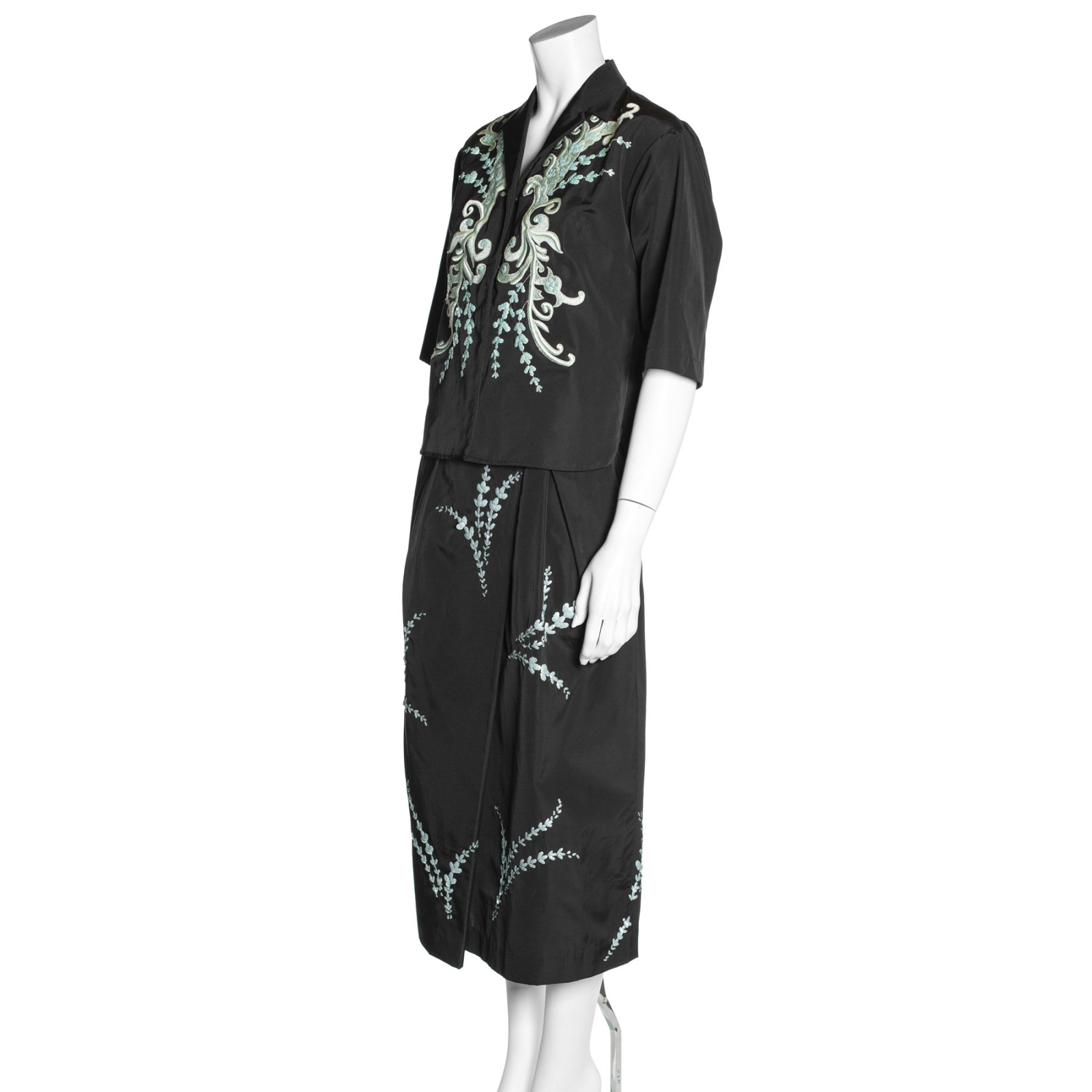 "spódnica z zakładką(rozmiar 36, wymiary: talia 36cm, długość 83cm) + żakiet (rozmiar 36, wymiary: biust 42cm, długość 60cm) czarne w miętowe hafty z aplikacją// skład 57% triacetate, 43% cotton"
