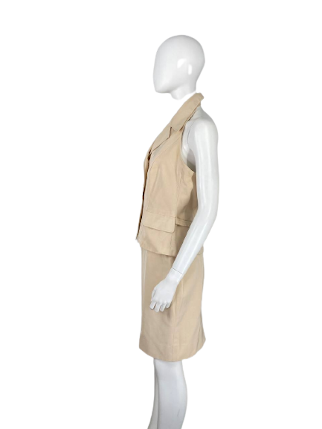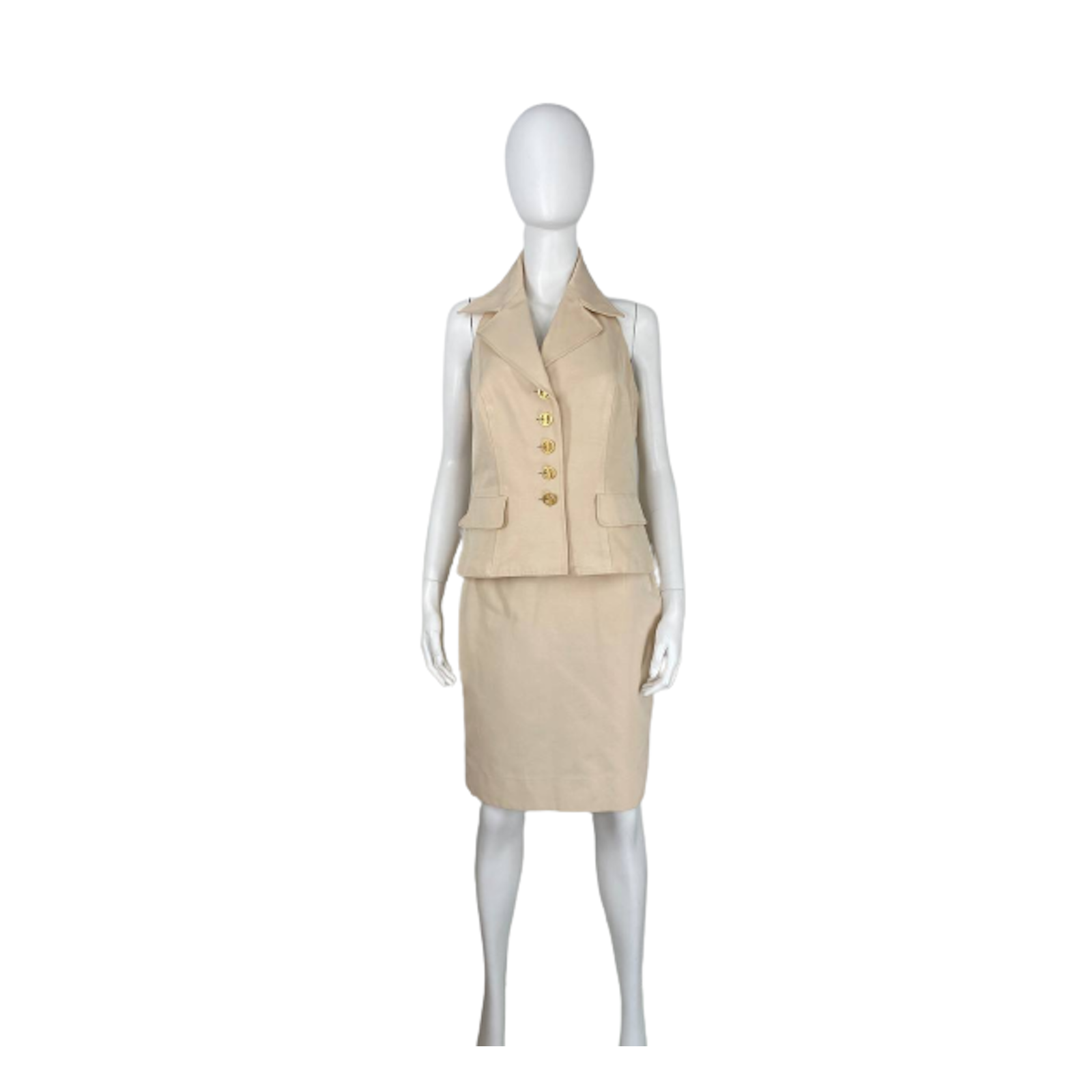 "komplet top+spódnica w kolore ecru, top z gołymi plecami, zapinanymi na złote guziki, kieszenie po bokach, rozmiar 42