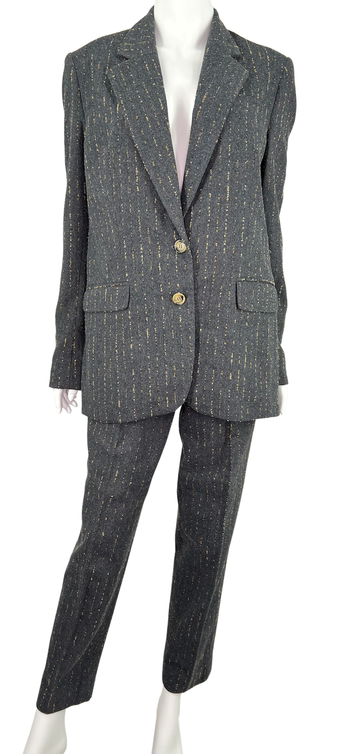 "ciemnoszary komplet, beżowe przeszycia w formie prążków, żakiet zapinany z przodu na dwa logowane guziki, boczne kieszenie z klapami, czarna podszewka, spodnie w kant, zapinane na zamek, tylne kieszenie z guzikami. Rozmiar S. Skład: 67% bawełna, 27% poliester 2% wełna. Wymiary: szer. ramion 41 cm, szer. biustu 52 cm, szer. talii 49 cm, dł. całkowita 75 cm, dł. rękawa 65 cm, spodnie szer. talii 41 cm, szer. bioder 45 cm, dł. całkowita 93 cm."