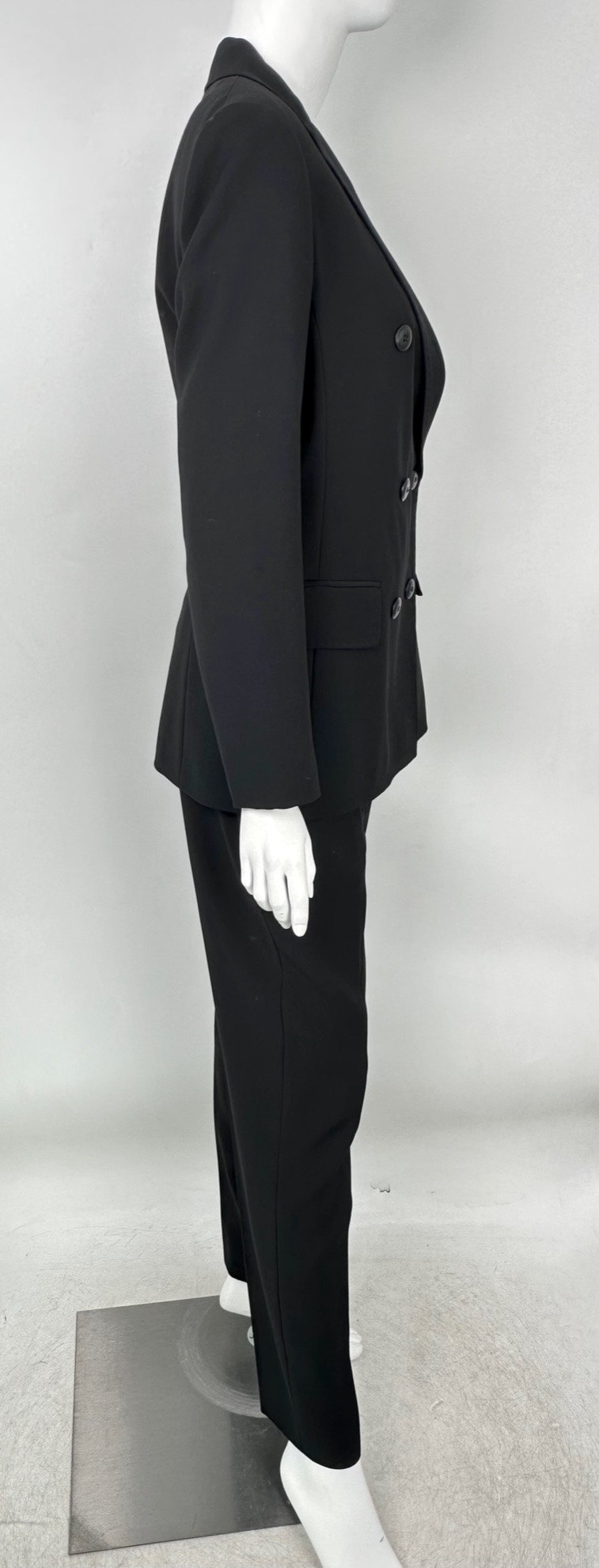 "czarny garnitur, marynarka zapinana z przodu, dwurzędowa, długi rękaw, boczne kieszenie z klapami zaszyte, spodnie w kant, lekko zwężana nogawka, zapięcie w talii na suwak i haftkę, boczne kieszenie oraz jedna z tyłu zaszyta. Widoczna dziurka na ramieniu, mała plamka na spodniach przy zapięciu. Rozmiar IT 42. Skład: 100% wełna. Wymiary: marynarka: szer. ramion 39 cm, szer. biustu 45 cm, szer. talii 44 cm, dł. całkowita 70 cm, dł. rękawa 56 cm, spodnie: szer. talii 42 cm, szer. bioder 48 cm, dł. całkowita 96 cm."