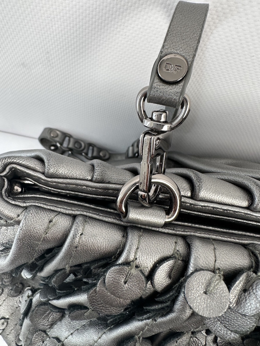 "Szara metaliczna skórzana kopertówka, ozdobiona przyszytymi okrągłymi elementami, zapinana na magnes, odpinany pasek, jedna komora wewnętrzna z jedną kieszenią zapinaną na suwak, biała podszewka w czarne groszki, używana. Stan bardzo dobry, lekko pozaciągane nitki na przodzie. Wymiary: szerokość 39cm, wysokość 26cm."