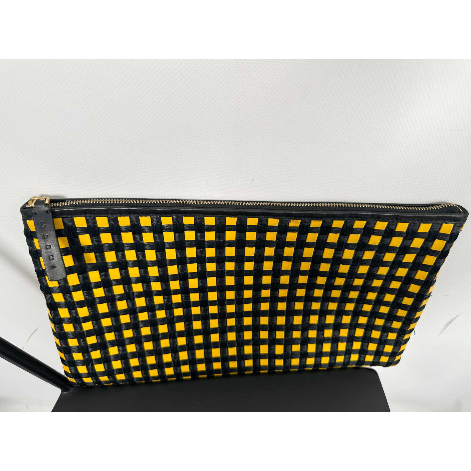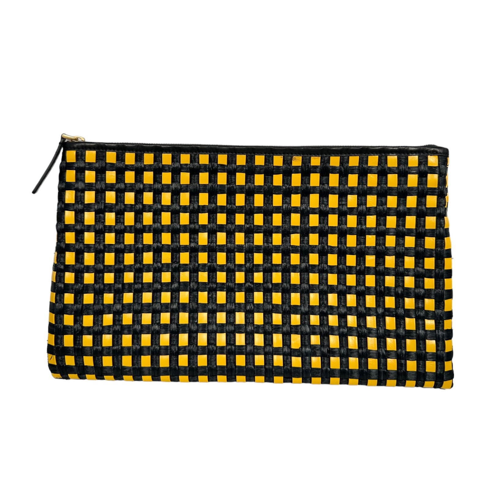 "Duża prostokątna skórzana kopertówka w żółto-czarną kratę, wykonana z łączonych materiałów, zapinana na złoty suwak wykończony skórzaną logowaną wstawką, jedna komora wewnątrz z trzema kieszeniami, w tym jedną zapinaną. Wymiary: szerokość 38,5cm, wysokość 23cm."