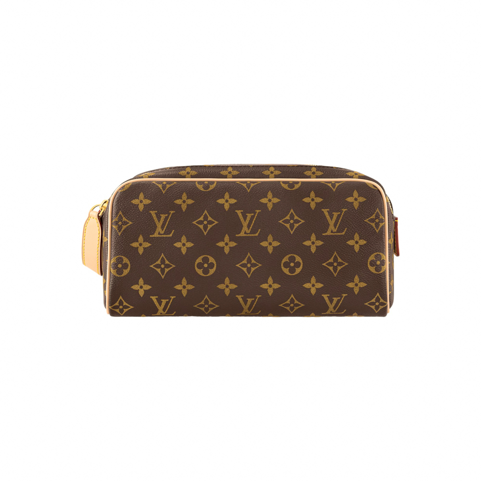 "Brązowa skórzana kosmetyczka w monogram marki, prostokątny kształt, zapinana na dwa złote suwaki w górnej części wykończone uchwytem w kolorze cielistym oraz kryty magnes, przyszyta metka z wytłaczanym logo z boku, jedna komora wewnątrz z zasuwaną kieszenią, w zestawie z dowodem zakupu oraz workiem przeciwkurzowym. Stan idealny, delikatne przetarcie w okolicy zapięcia magnetycznego. Wymiary: szerokość 26cm, wysokość 13cm, głębokość 15cm."