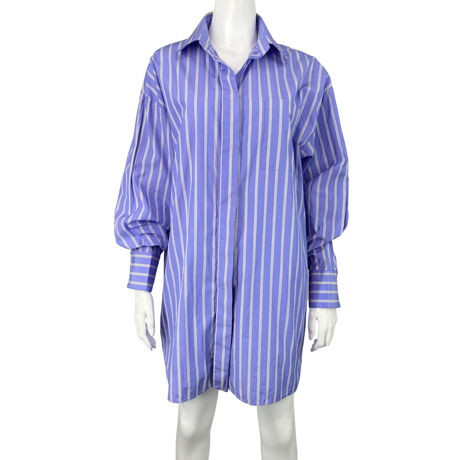 "błękitna koszula w białe pasy, na plecach kwiaty, piwonie. Rozmiar 36, oversize. 100% bawełna. Wymiary: dł. całkowita 90cm, szer. biust 60 cm, szer. ramiona 50cm, dł. rękaw 58 cm"
