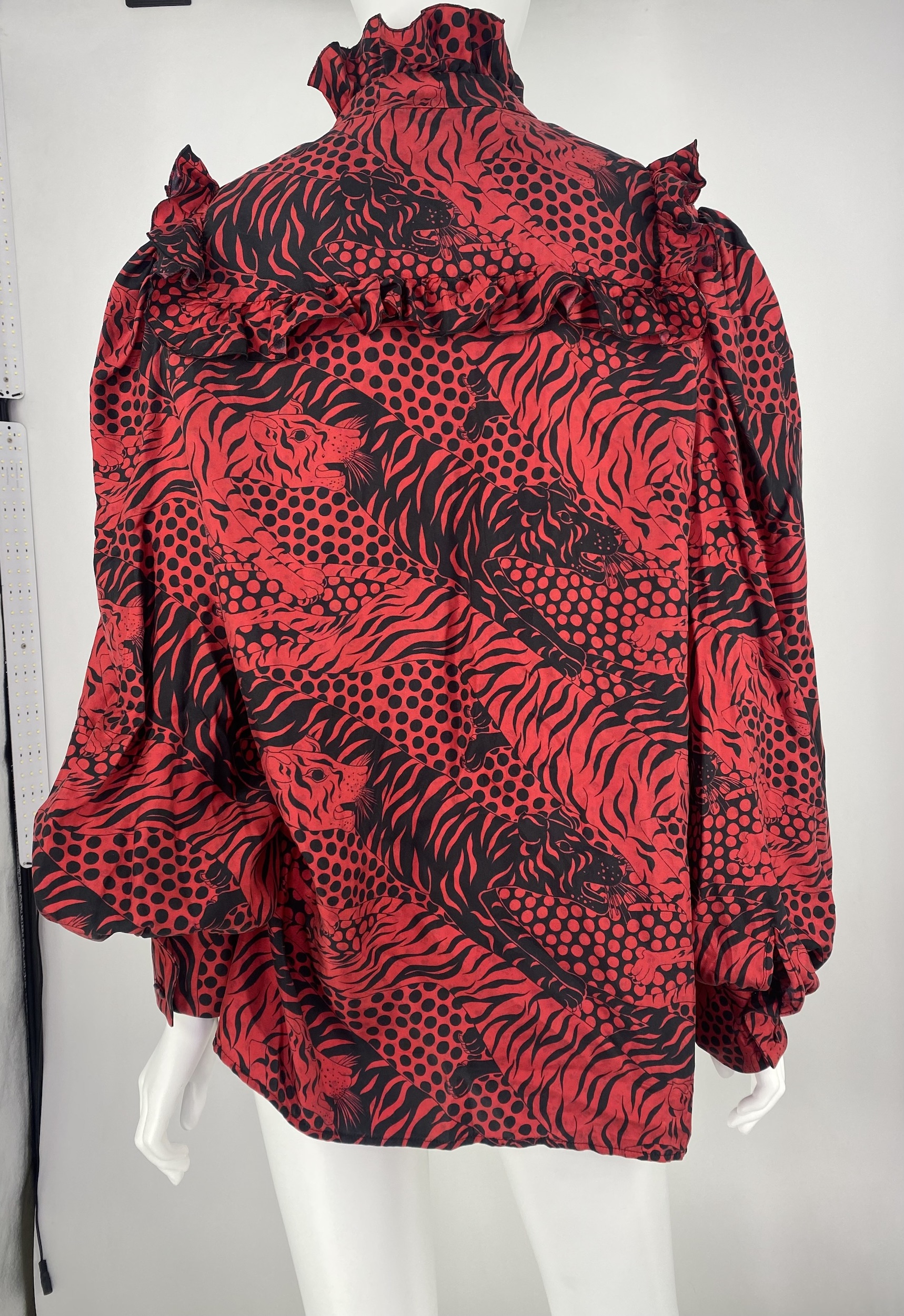 "czerwona koszula Gucci Toger Print Silk Blouse w czarny deseń, obszyta falbanami przy kołnierzu, zapinana z przodu na kryte guziki, długi rękaw z mankietami. Rozmiar IT 44. Skład 100% jedwab. Wymiary: szer. ramion 40 cm, szer. biustu 57 cm, szer. talii 56 cm, dł całkowita 72 cm, dł. rękawa 65 cm."