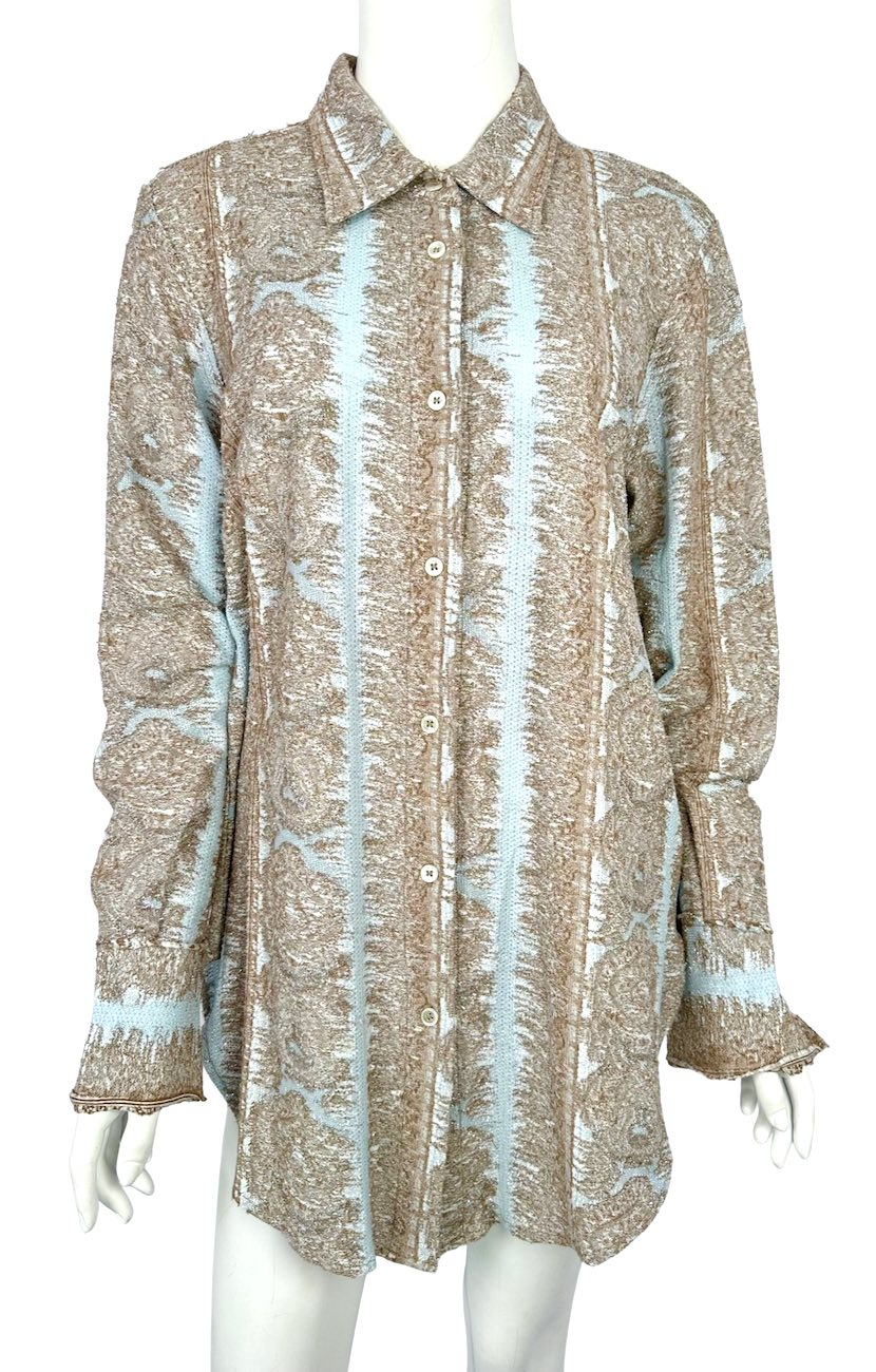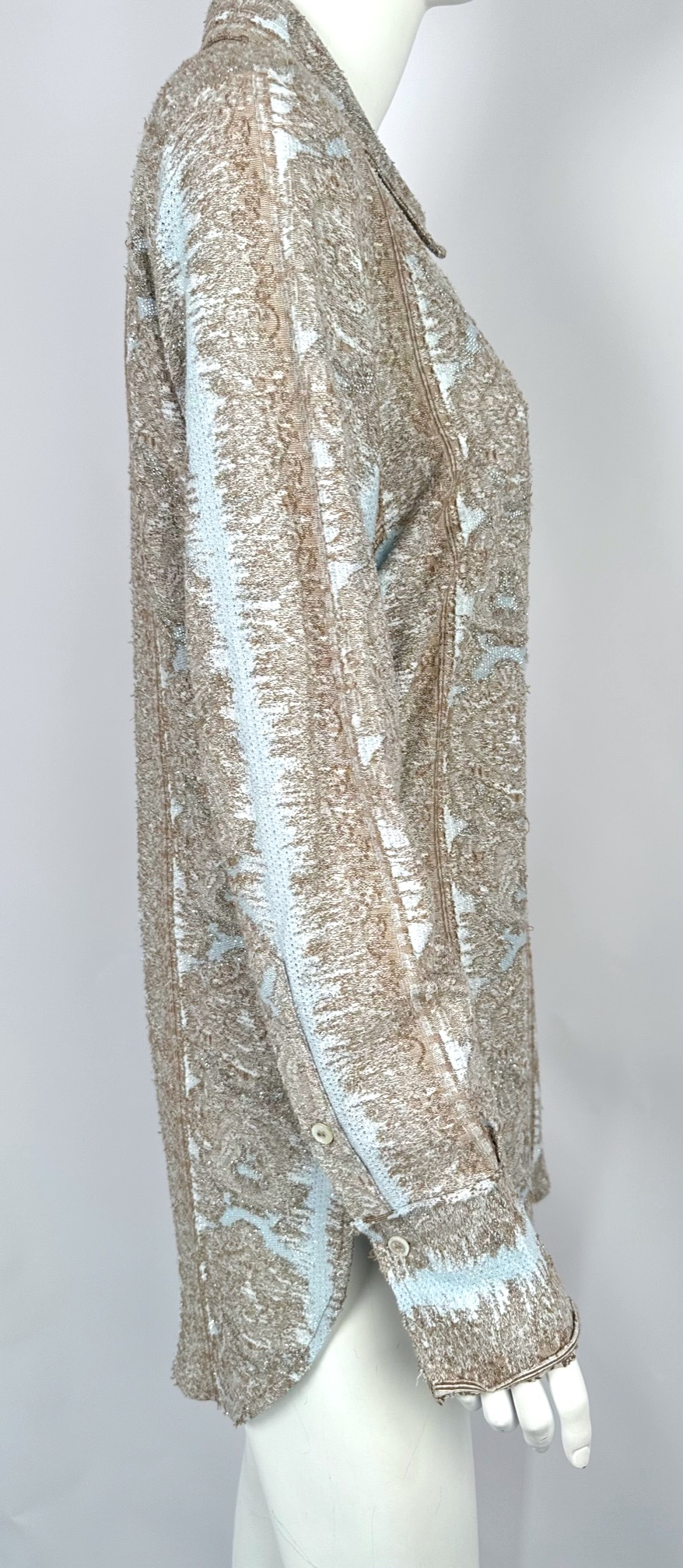 "koszula błękitno beżowa, z połyskującą nitką, zapinana z przodu na guziki, długi rękaw. Rozmiar S. Skład 91% bawełna, 5% metallic. Wymiary: szer. ramion 42 cm, szer. biustu 48 cm, szer. talii 46 cm, dł. całkowita 84 cm, dł. rękawa 63 cm."