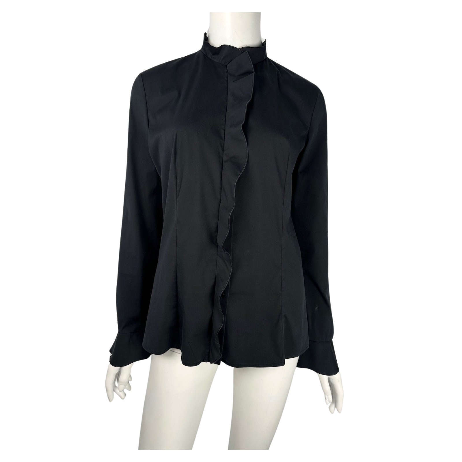 "Czarna, bawełniana koszula z falbankami. Zdobią one front koszuli, dekolt oraz wykańczają rękawy. Po długości oraz przy mankietach rękawów zapinana jest na małe guziki w kolorze czarnym. Od frontu ma dwa wyraźne przeszycia. Stan: bardzo dobry. Rozmiar z metki: 42, europejskie: 38. Skład: 75% bawełna, 20% poliamid, 5% elastan. Wymiary: dł. mierzona od karku: 62 cm., szer. (mierzona od pachy do pachy): 46 cm., dł. rękawa (mierzona od pachy): 49 cm., szer. mankietu: 9 cm., szer. rękawa (mierzona na linii pachy): 18 cm, szer. (mierzona w talii): 41 cm."