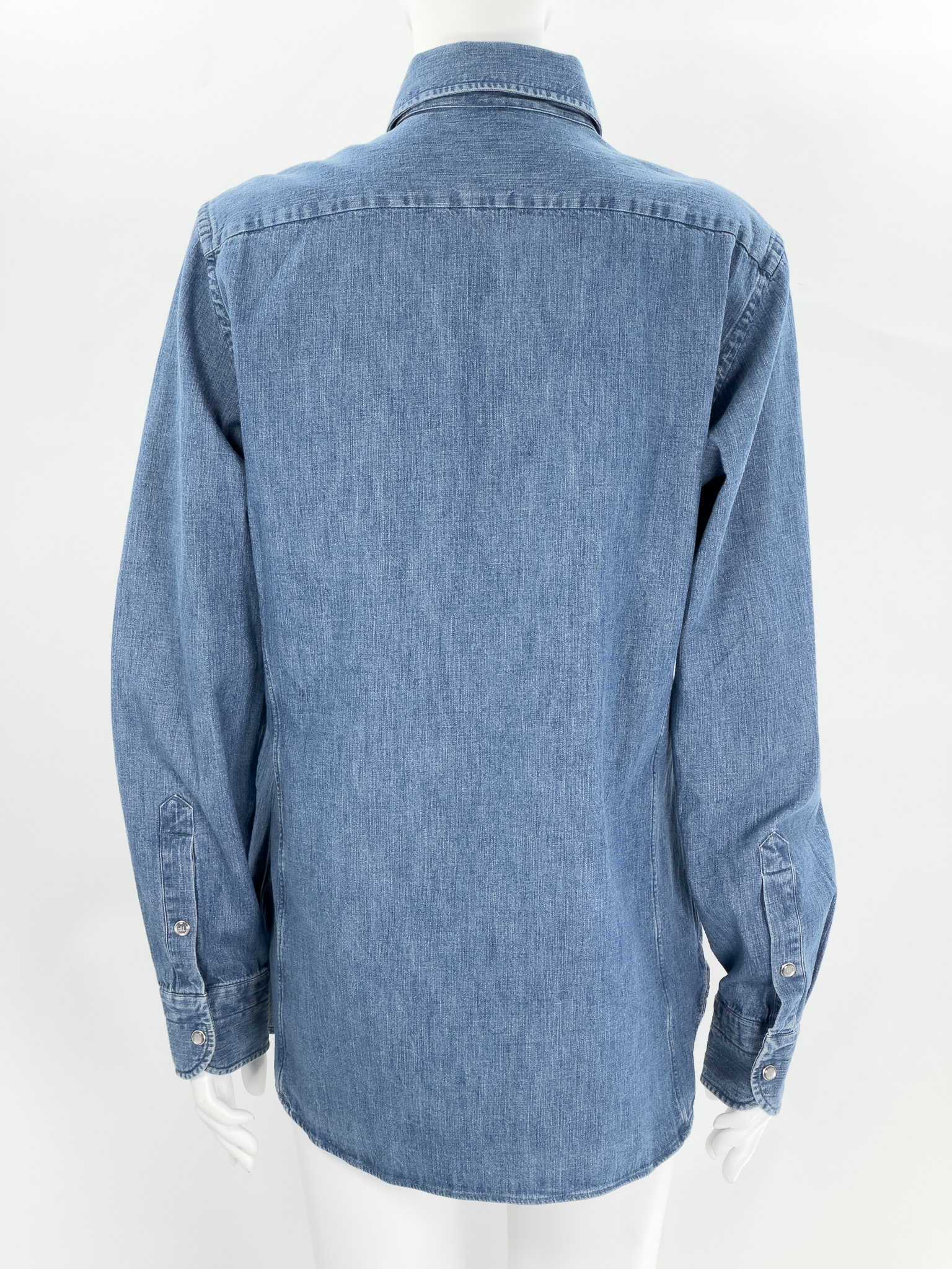 "Niebieska koszula jeansowa, cienka, zapinana na biało-srebrne zatrzaski, kołnierzyk, dwie kieszenie z klapami w okolicy biustu, dekoracyjne przeszycia, zaokrąglony dół, rozpinane mankiety. Stan dobry, delikatnie zabrudzona w centralnej części. Rozmiar z metki 41/16. Skład: 100% bawełna. Wymiary: szerokość mierzona od pachy do pachy 57cm, długość całkowita 74cm."
