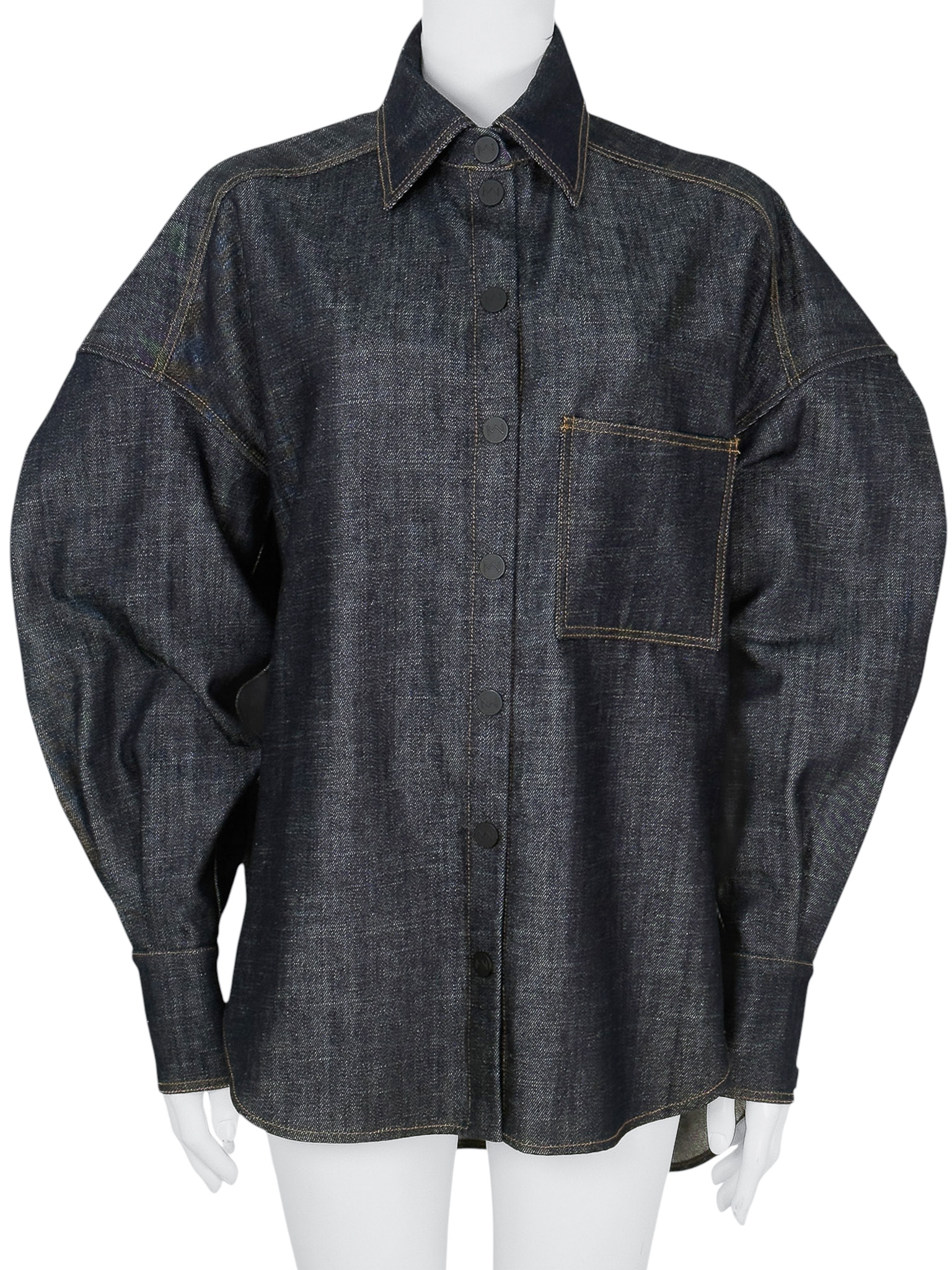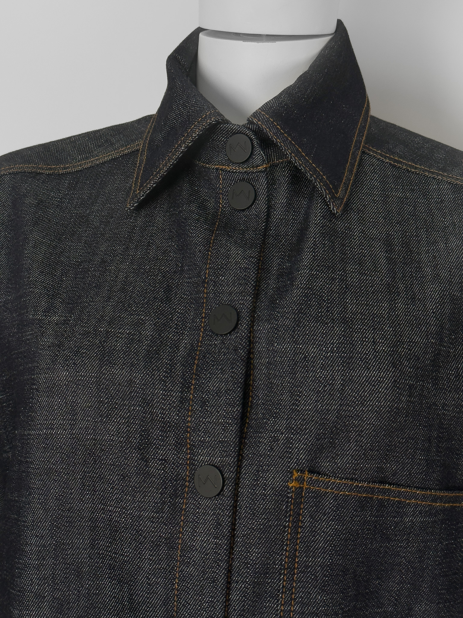 "Bilboa Shirt denim blue; Oversizowa koszula z grubego denim, w kolorze ciemnego granatu, przedłużony tył, wykończona musztardową nitką, kołnierzyk, zapinana na czarne logowane zatrzaski, duża kieszeń w okolicy biustu. Stan nowa z metką. Rozmiar z metki 36. Skład: 100% bawełna. Wymiary: szerokość mierzona od pachy do pachy 64cm, długość całkowita 74cm."