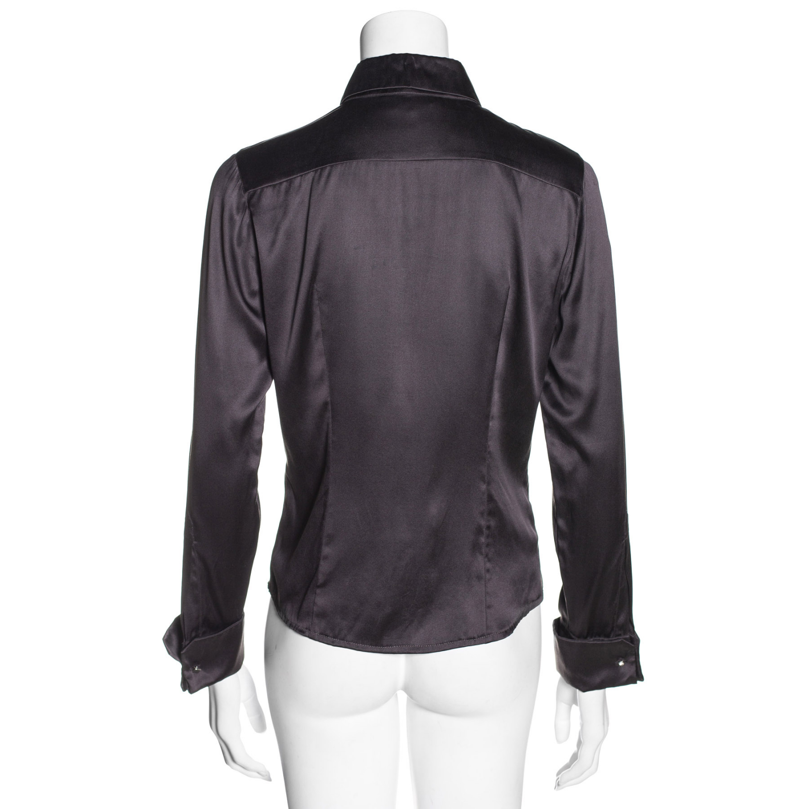 "93% jedwab i 7 elastan, czarna ale w swietle odcień bakłażanowy, rozmiar 38 , mankiety zapinane na guzik z kryształku