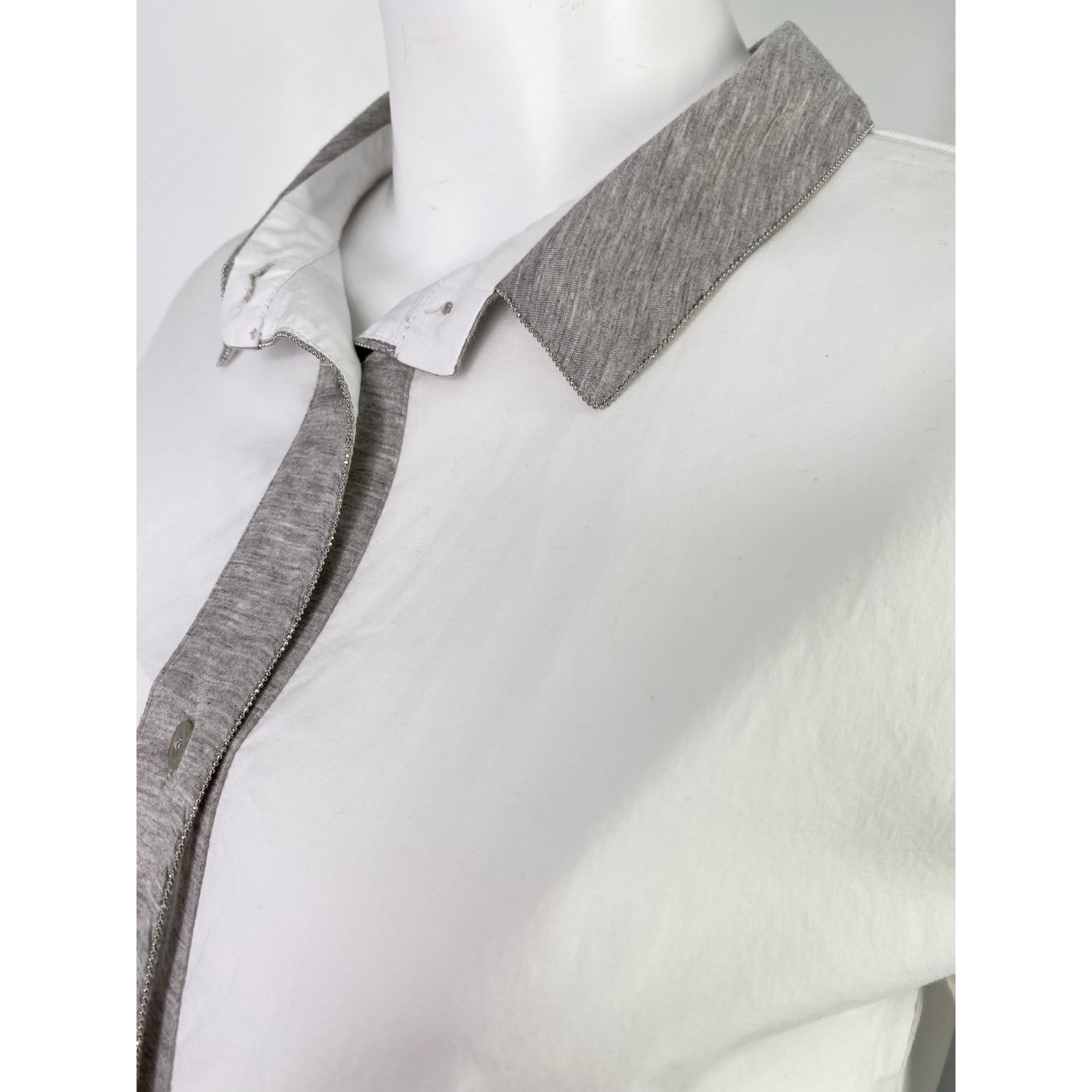 "biała bluzka/ koszula z kołnierzykiem, zapinana na guziki, tył z materiału prążkowanego, krótki rękaw. Kołnierzyk i lamówka przy guzików szara z srebrnymi koralikami. Rozmiar XL( wypada na mniejszy). Skład: 96% bawełna, 4% elastan. Wymiary: szer. ramion 42 cm, szer. biustu 46 cm, szer. talii 46 cm, dł. całkowita 63 cm."