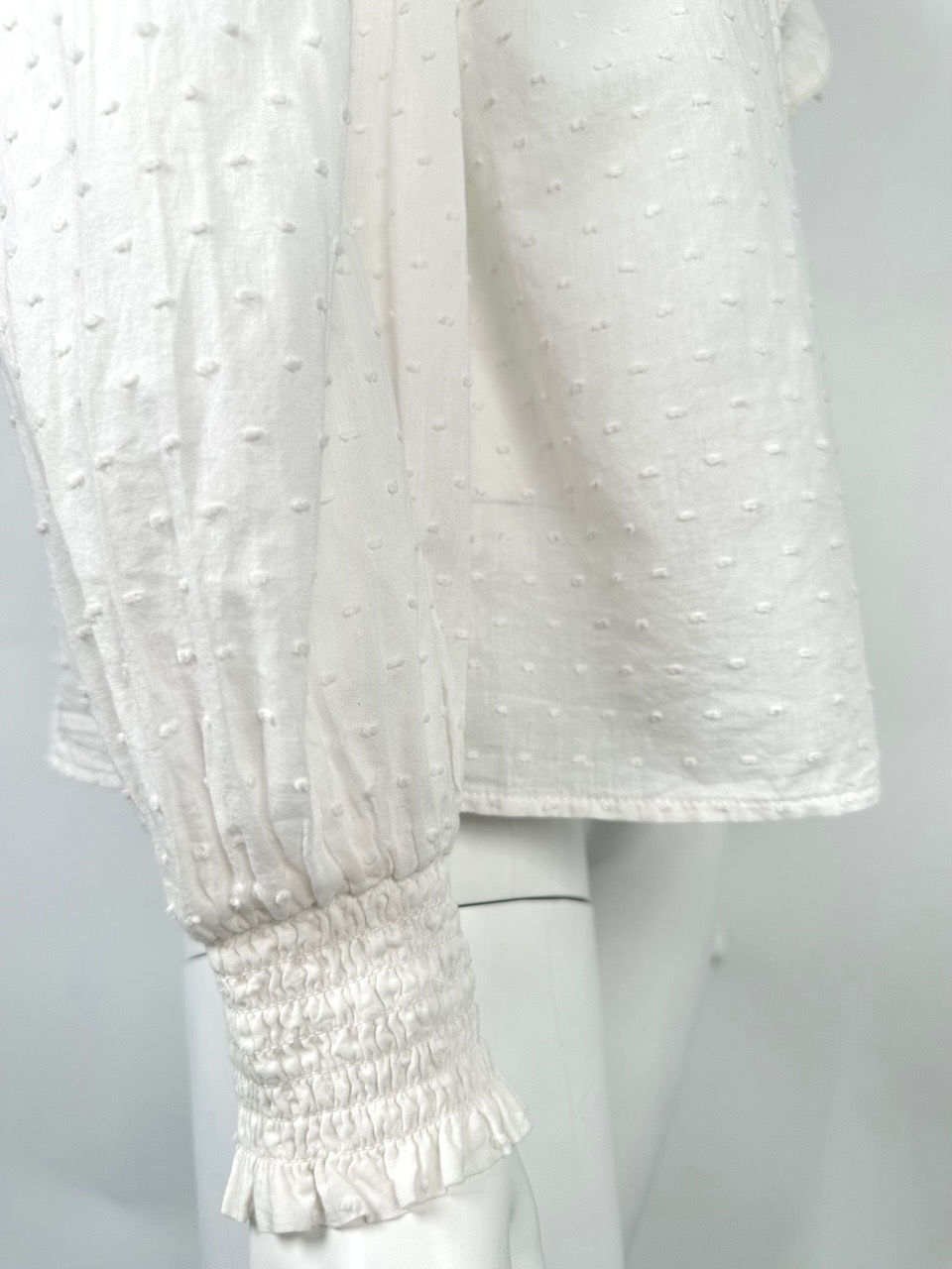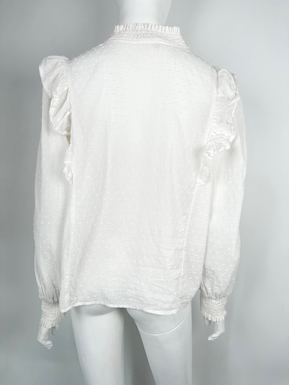 "biała koszula z długim rękawem, zapinana z przodu na guziki, wyszywane małe kropeczki, przód ozdobiony marszczeniami i falbankami. Rozmiar 40. Skład: 100% bawełna. Wymiary: szer ramion 36 cm, szer. biustu 45 cm, szer. talii 52 cm, dł. całkowita 59 cm, dł. rękawa 60 cm."