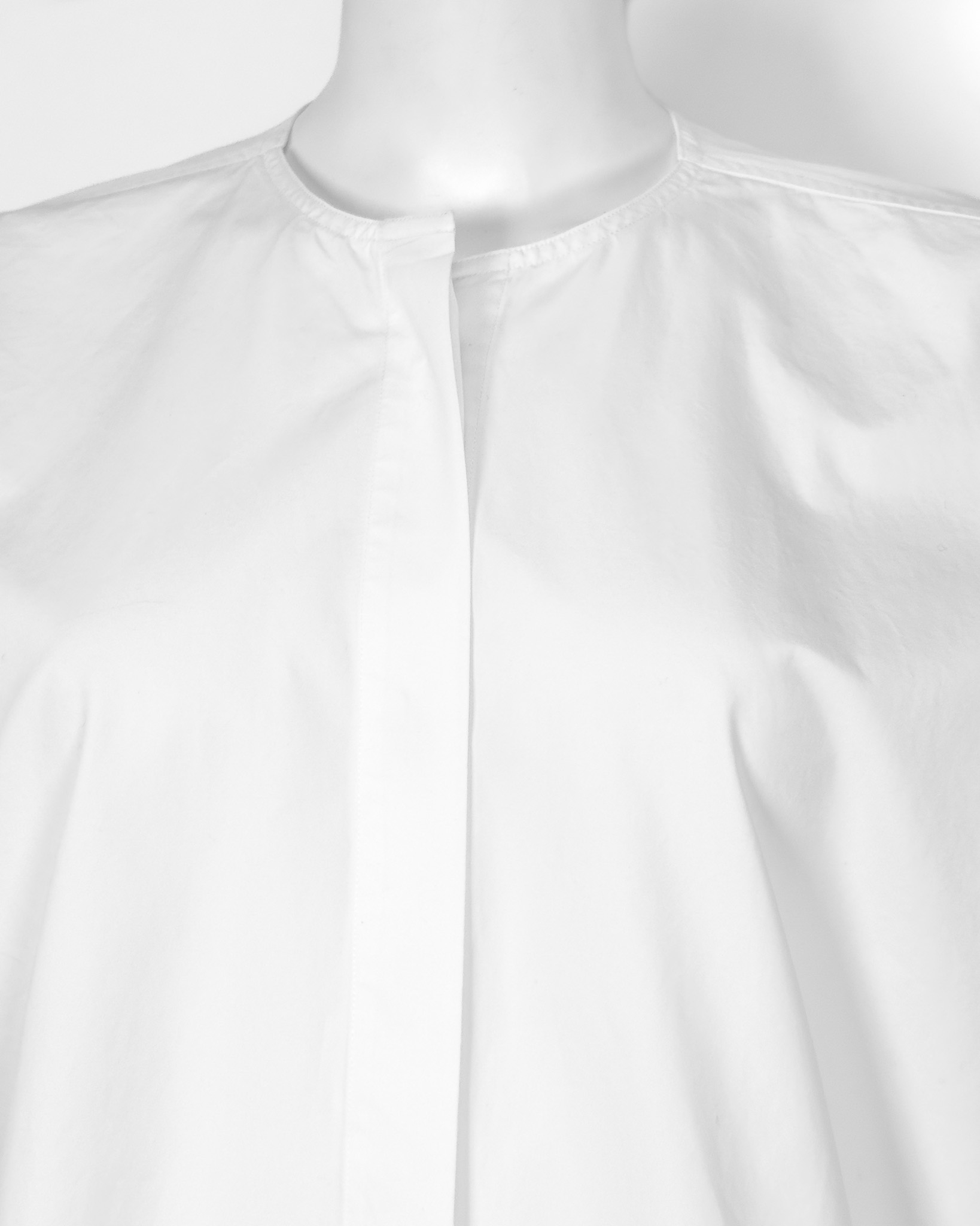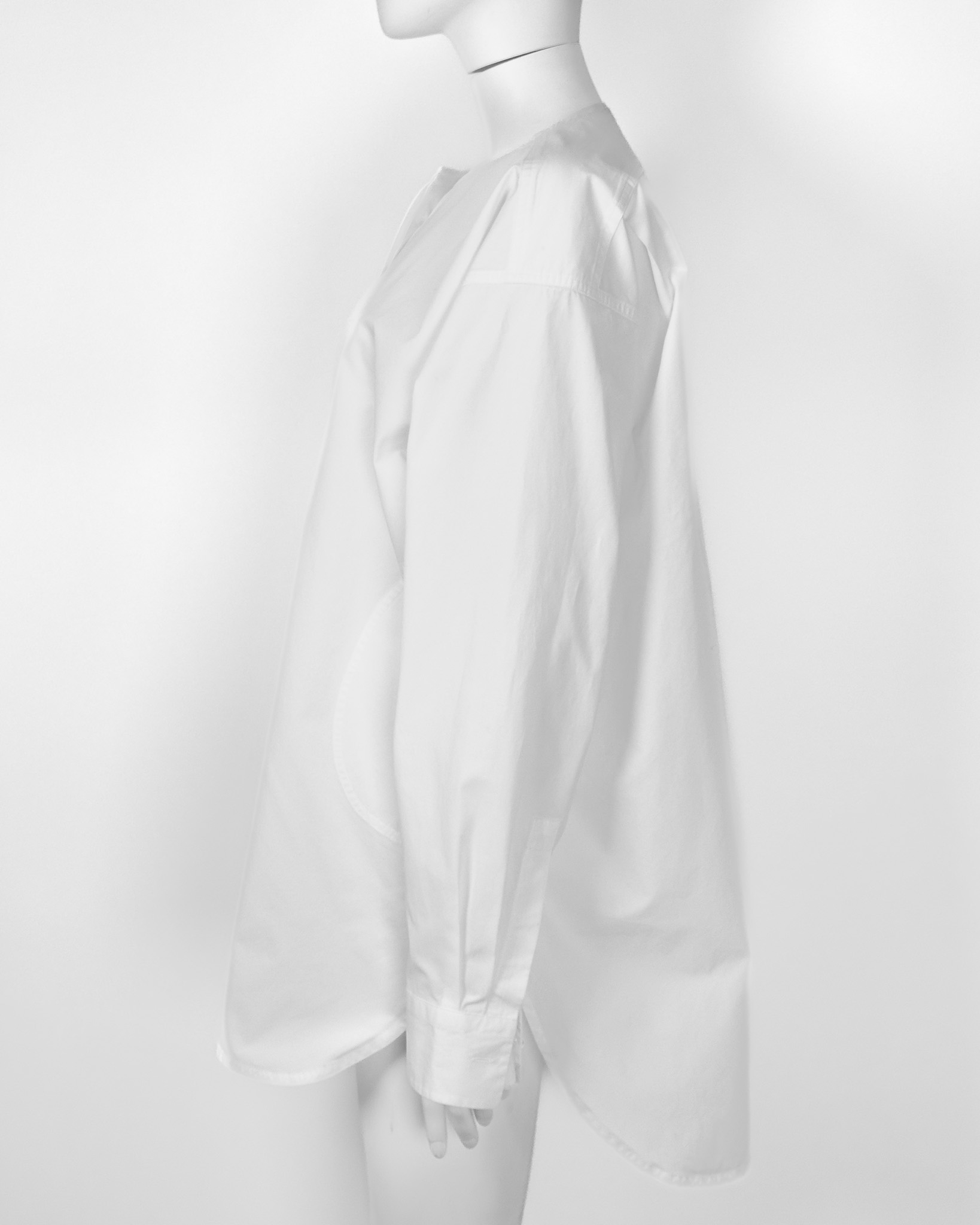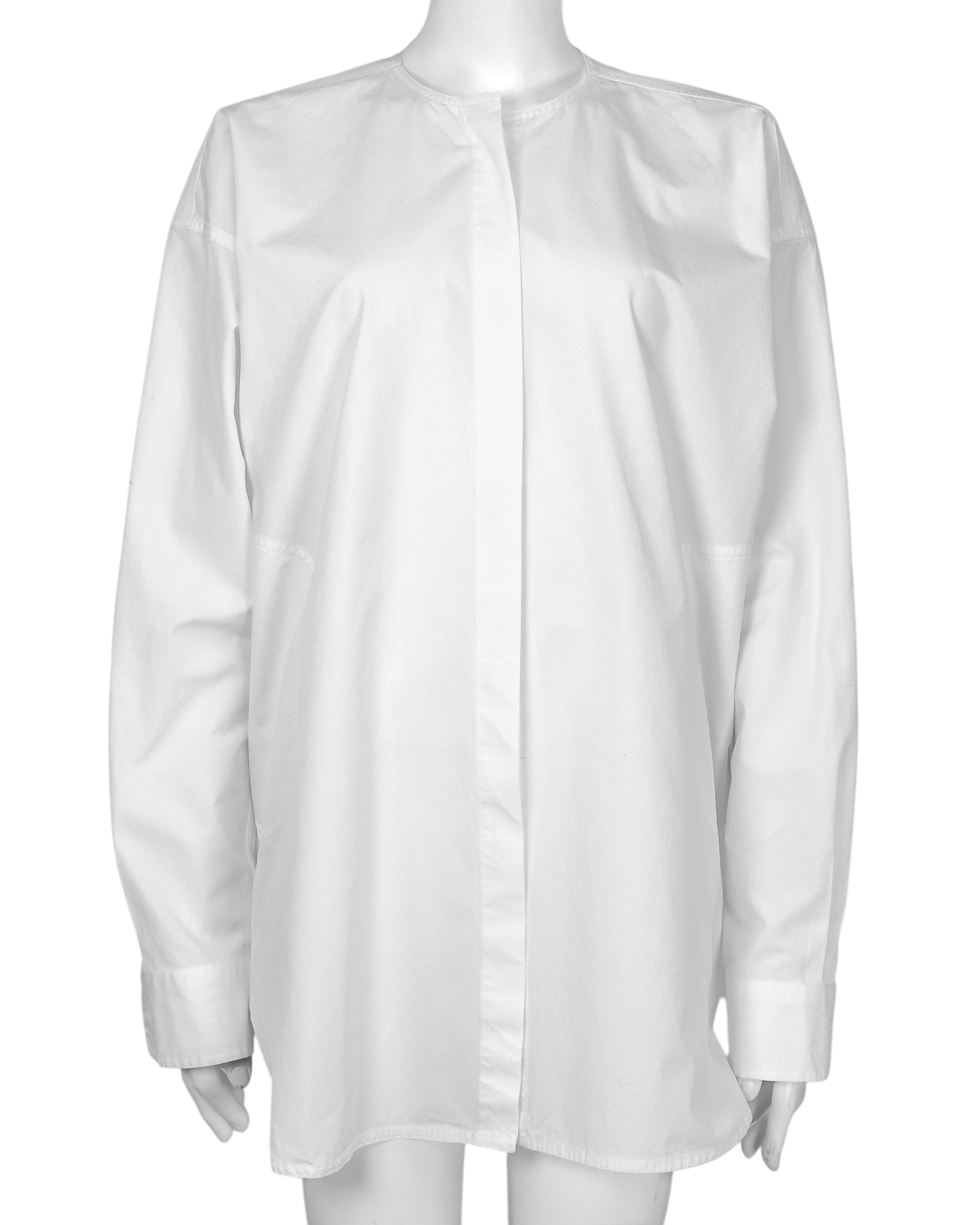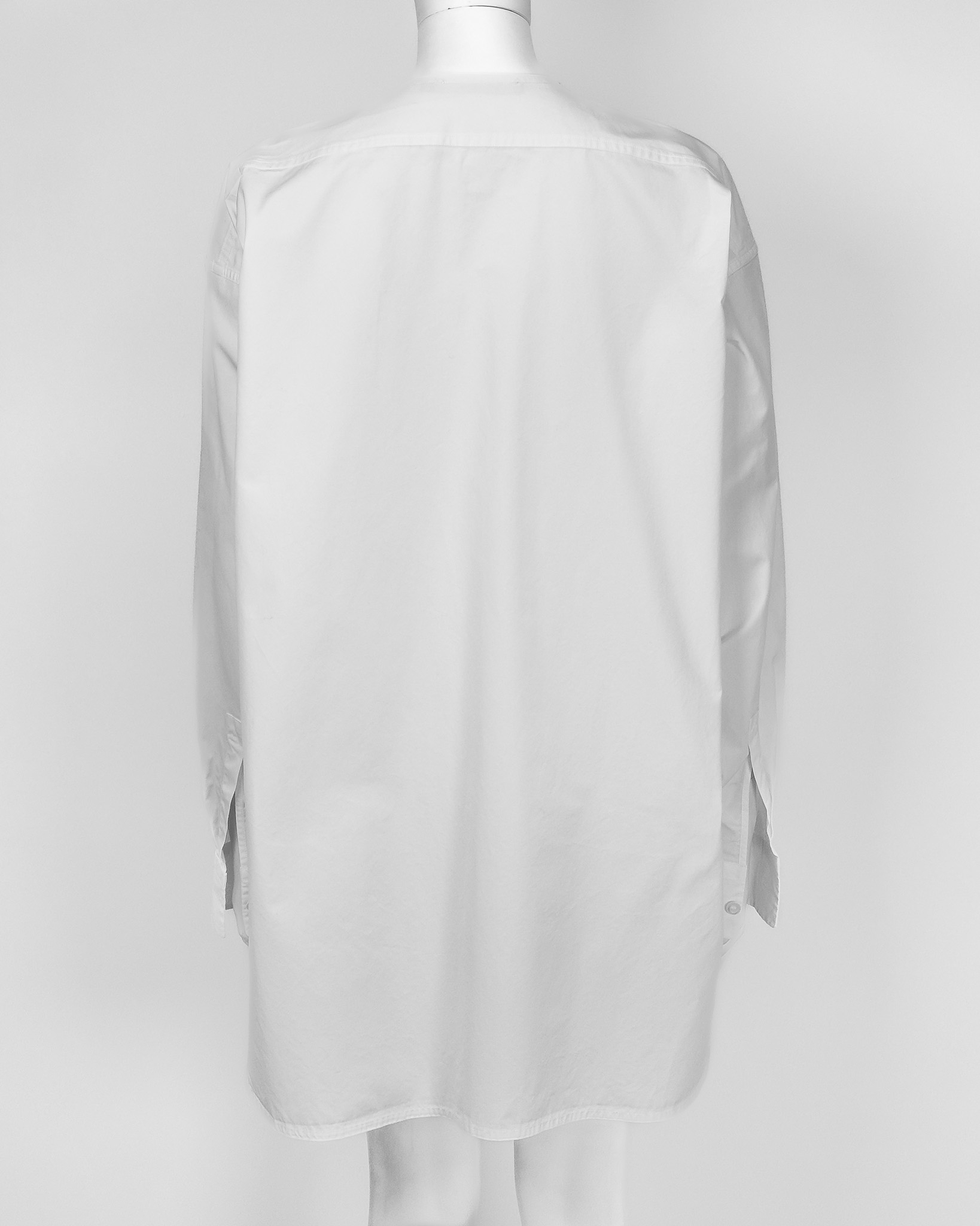 "Biała obszerna koszula z bawełny, z przodu posiada dwie naszyte kieszenie, minimalistyczny fason, zapinana na guziki. Koszula ma lekko obniżoną linię ramion. Skład: 100% bawełna. Rozmiar z metki 40. Stan idealny. Wymiary: szerokość mierzona od pachy do pachy 68cm, długość całkowita 78,5cm."