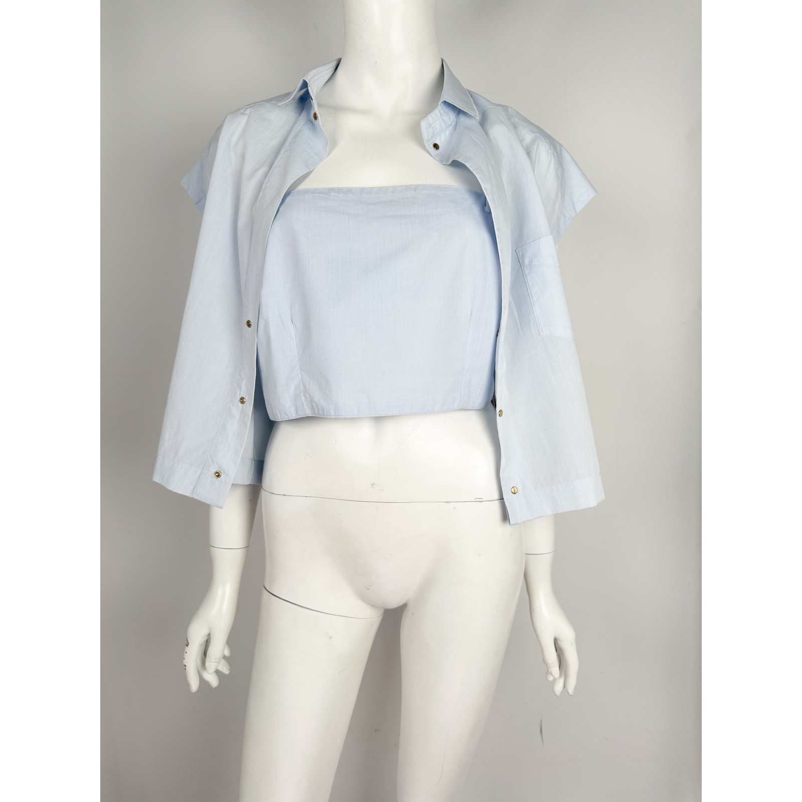 "Błękitna bawełniana koszula z krótkim rękawem z topem w komplecie; koszula zapinana na złote zatrzaski, kieszeń w okolicy biustu, kołnierzyk, top na ramiączkach, prosty dekolt, zapinany w bocznej części na zatrzaski. Rozmiar z metki S. Skład: 100% bawełna. Wymiary koszuli: szerokość mierzona od pachy do pachy 49,5cm, długość całkowita 51cm; wymiary topu: szerokość mierzona od pachy do pachy 42,5cm, długość całkowita 23cm."