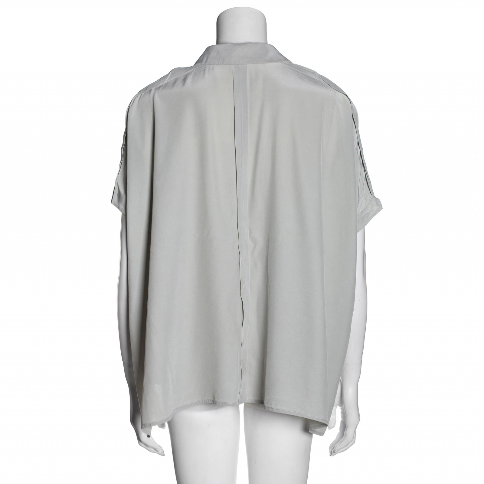 "Koszula oversize z kołnierzykiem, zapinana na kryte guziki, szara. 100 % jedwab. Wymiary: szerokość 80 cm., długość całkowita przód 52 cm. tył 64 cm."