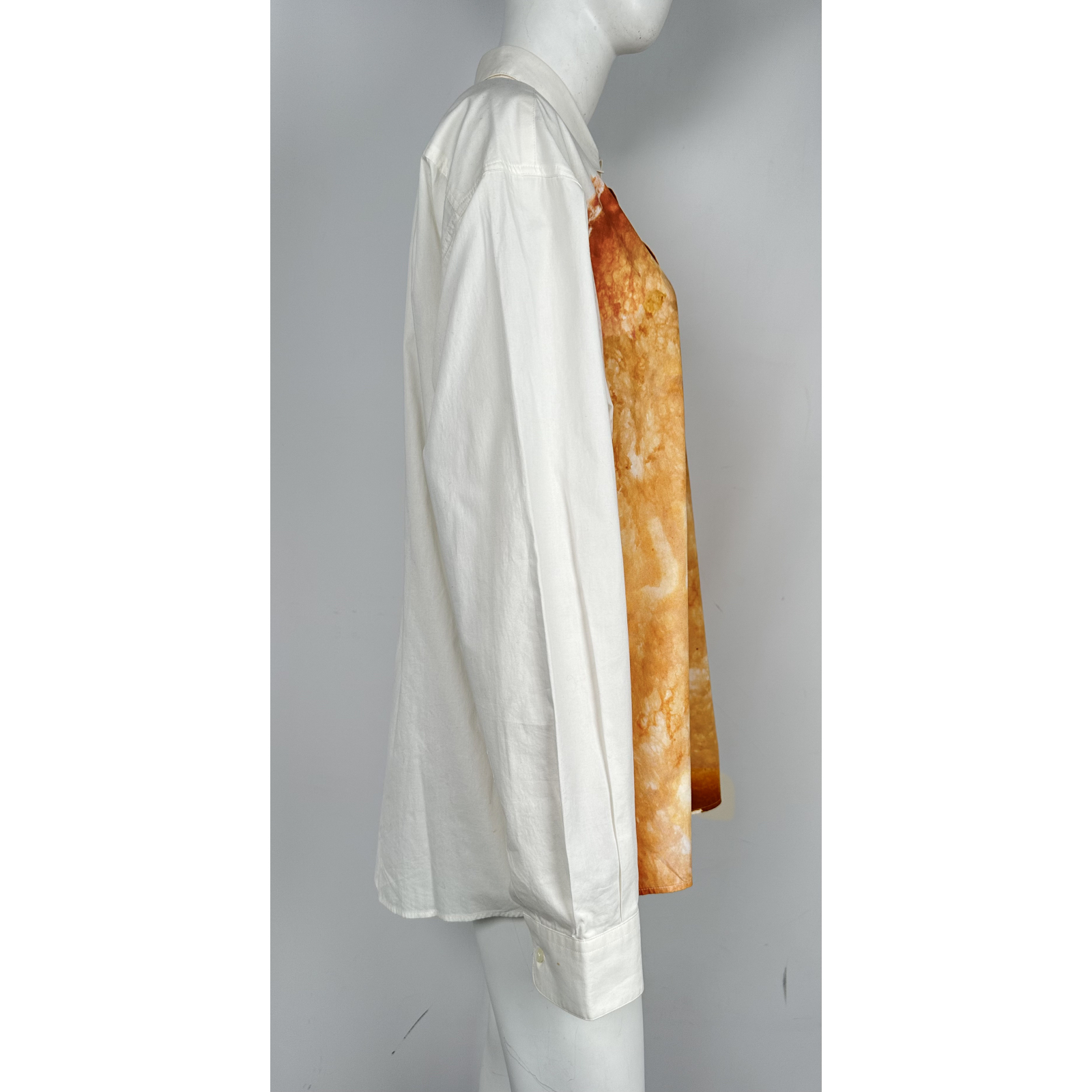 "Kremowa bawełniana koszula ozdobiona pomarańczową grafiką w centralnej części, zapinana na guziki, kołnierzyk, rozpinane mankiety, rozcięcia po bokach, delikatnie zaokrąglony dół, używana. Stan bardzo dobry, delikatnie zabrudzona przy prawym mankiecie. Rozmiar z metki 50. Skład: 100% bawełna. Wymiary: szerokość mierzona od pachy do pachy 63cm, długość całkowita 69cm, długość rękawa 61cm."
