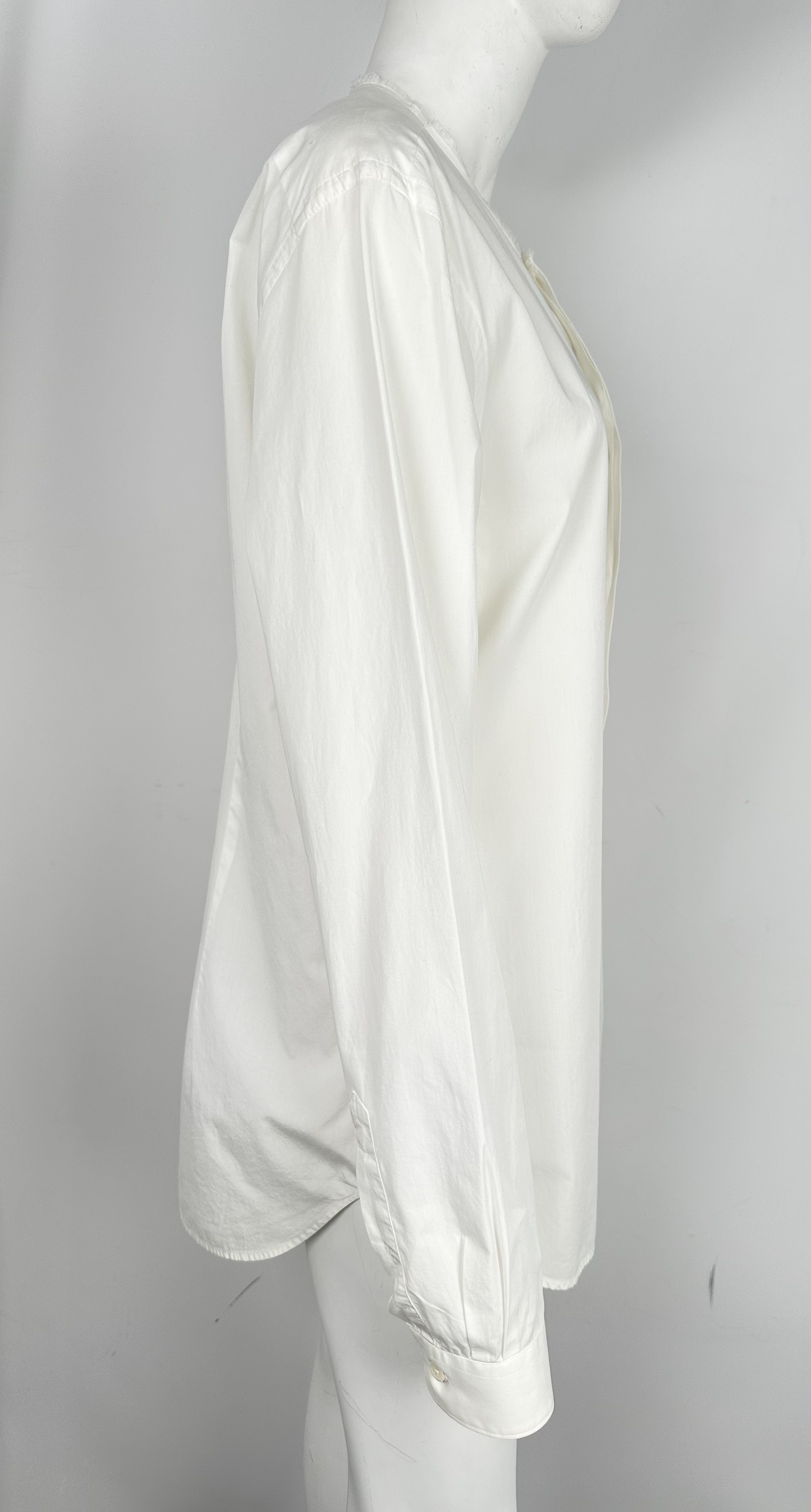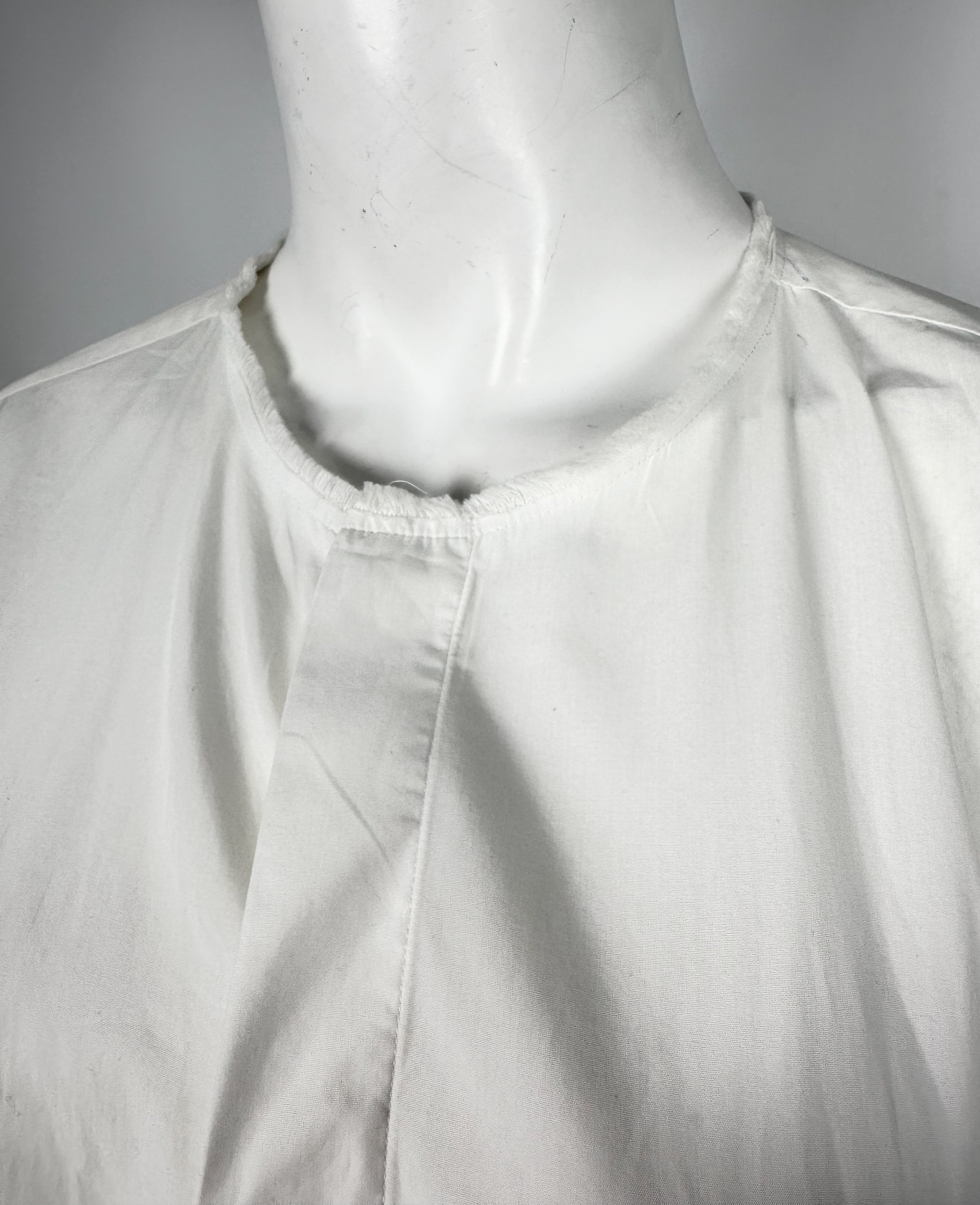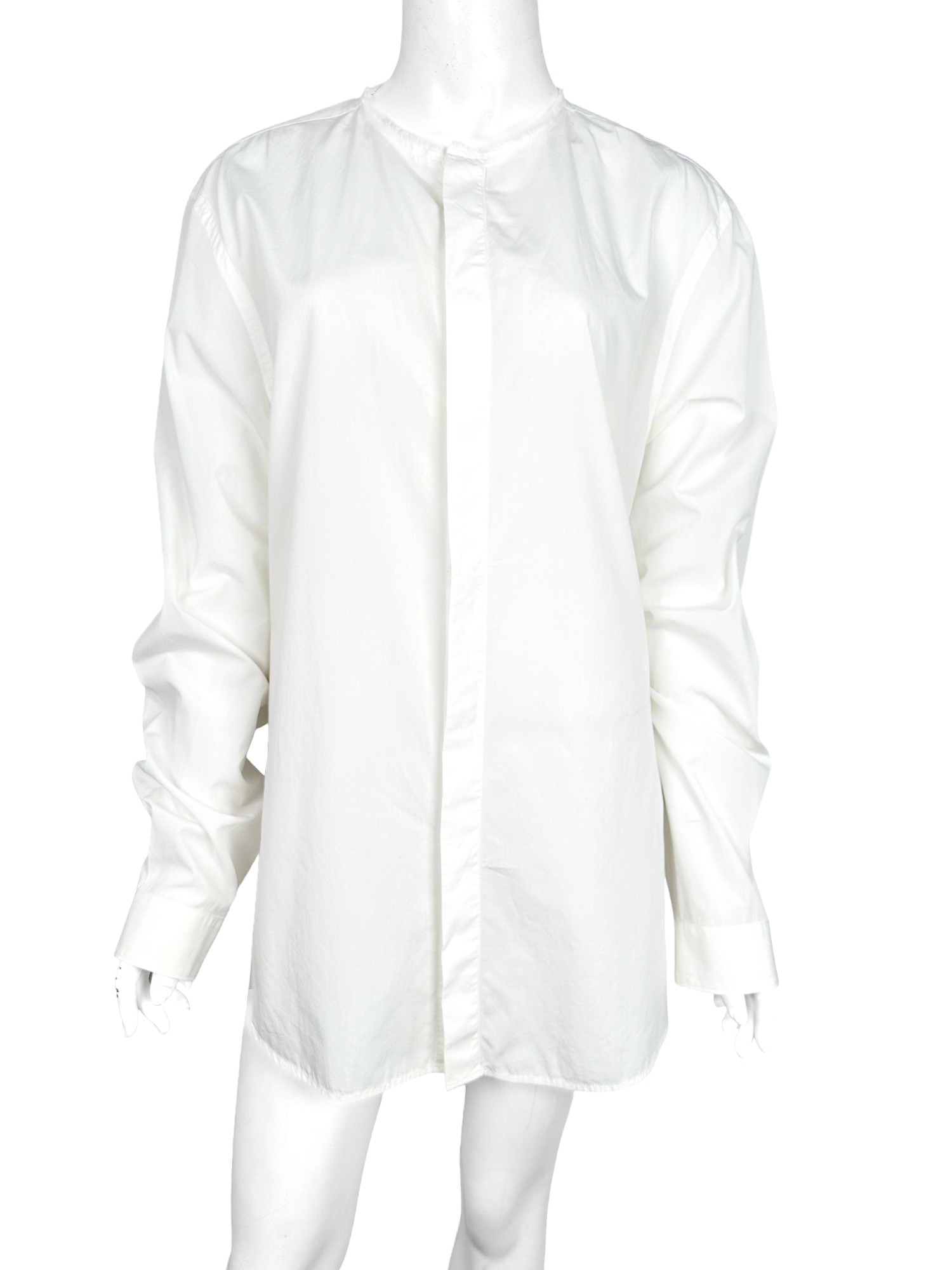 "Biała koszula krój oversize, kryte guziki, bez kołnierzyka. Rozmiar z metki 54. Skład: 100% bawełna. Wymiary: szerokość mierzona od pachy od pachy 56cm, długość całkowita 78cm, długość rękawa 67cm."