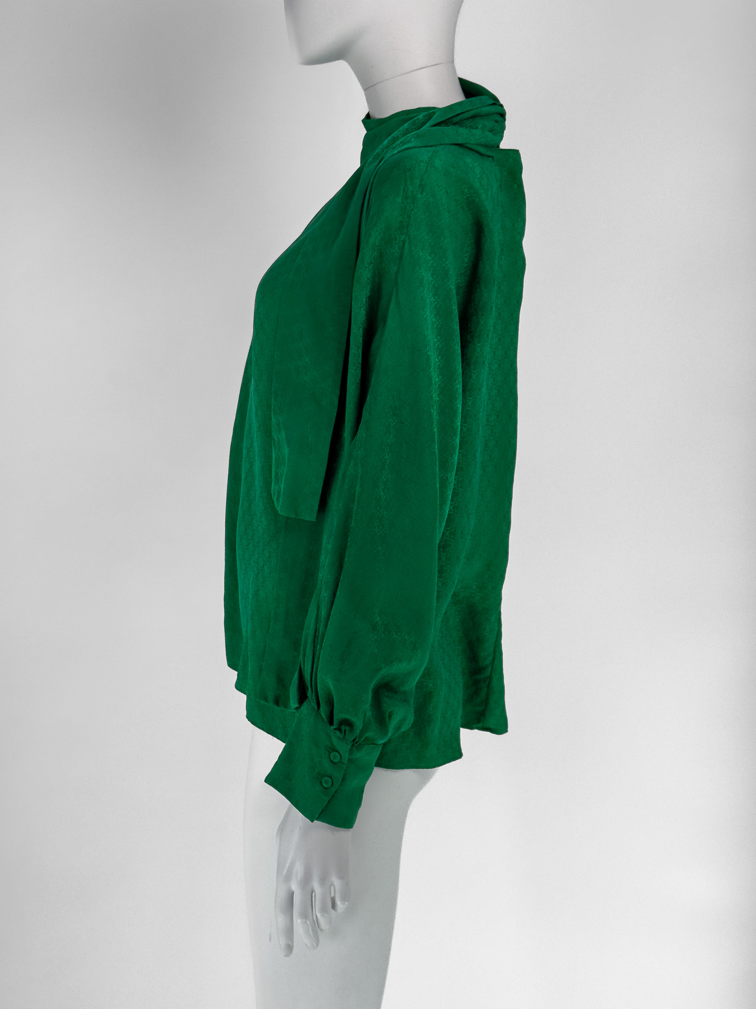 "Zielona koszula w monogram marki, wiązanie w tylnej części w okolicy szyi, zapinana na jeden guzik, stójka, bufiaste rękawy, rozpinane mankiety. Rozmiar z metki L. Brak metki ze składem. Wymiary: szerokość mierzona od pachy do pachy 53cm, długość całkowita 62cm."