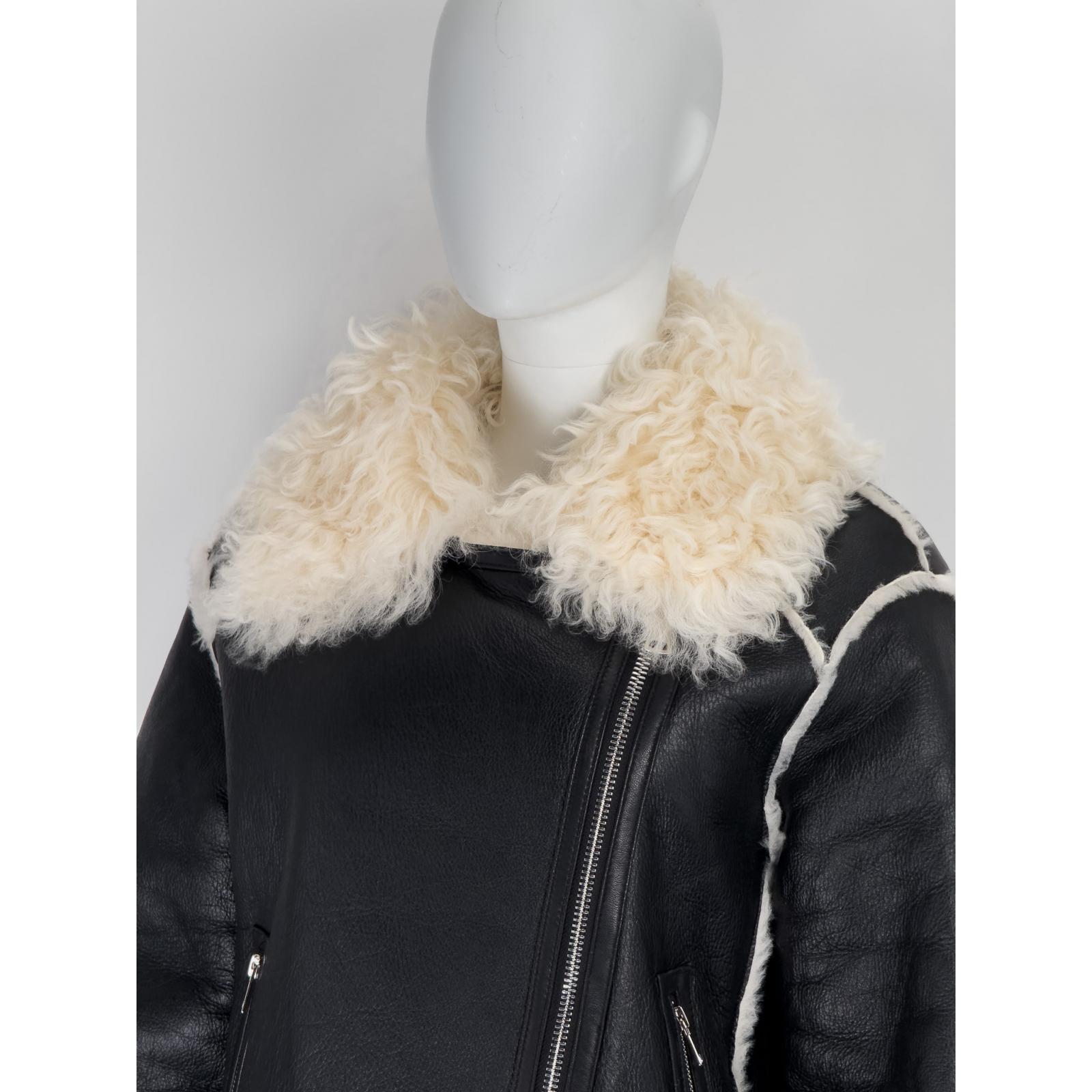 "Czarny skórzany kożuch ozdobiony kremowym futrem przy kołnierzu, krótki, miękka skóra, zapinany na srebrny suwak, dwie kieszenie po bokach, białe futrzane przeszycia. Rozmiar z metki S. Skład: 100% skóra jagnięca. Wymiary: szerokość mierzona od pachy do pachy 54cm, długość całkowita 60cm."