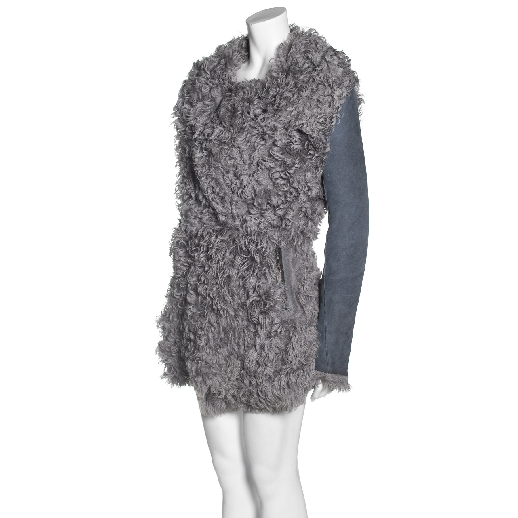"Kożuch , szary (niebieskawy odcień), z futrem na zewnątrz. Zapinany na guzik. kieszenie zapinane na suwak. Rękawy ze skóry na dole suwak. Rozmiar 6. Wymiary: ramiona 40 cm. biust 45 cm . długość rękawów 68 cm długoś całkowita 80 cm"