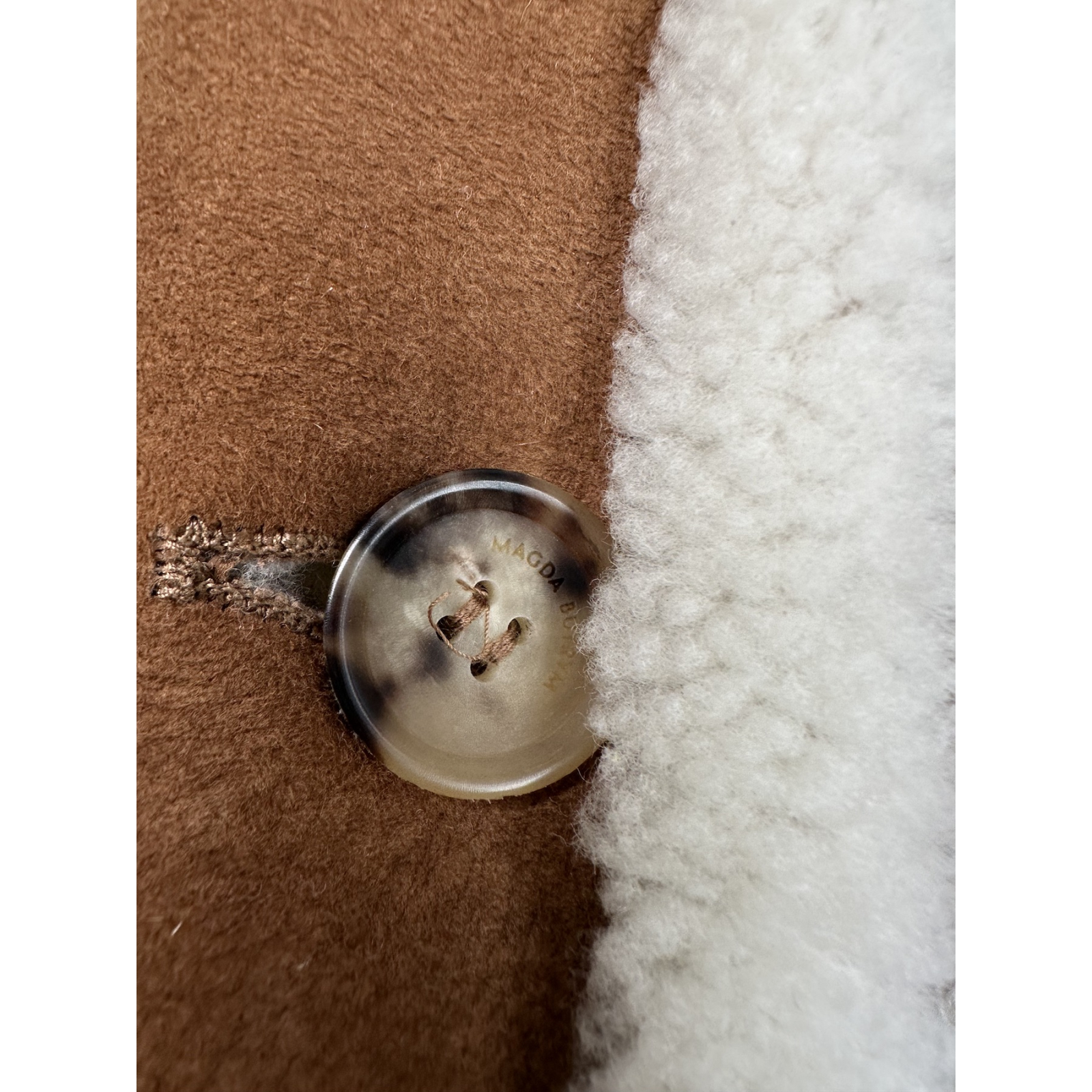 "Kożuch jasnobrązowego zamszu, ozdobiony od wewnątrz naturalnym barankiem, odsłoniętym na wykończeniach, kieszeniach i kołnierzu. Haft w kształcie róży. Brak informacji o rozmiarze; sample. Wypada M/L. Wymiary: dł. całkowita 81 cm, szer. ramiona 60 cm, szer. biust 63 cm"
