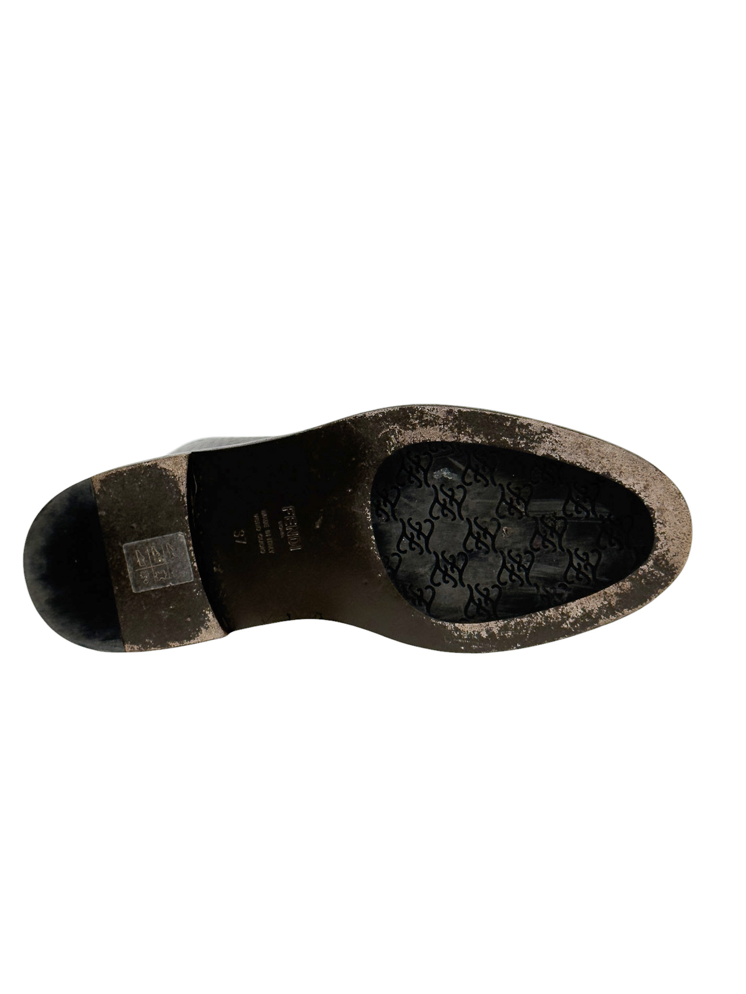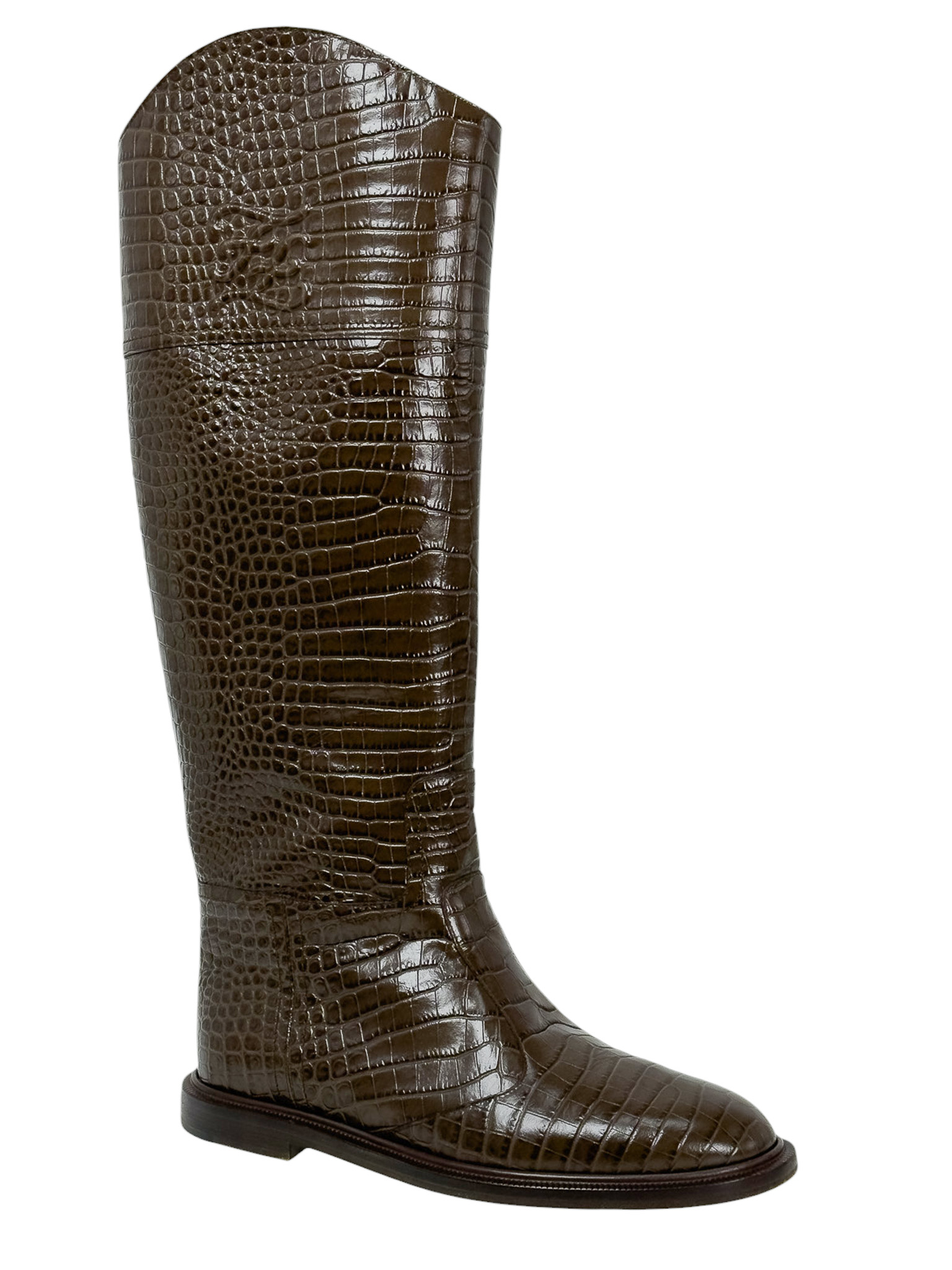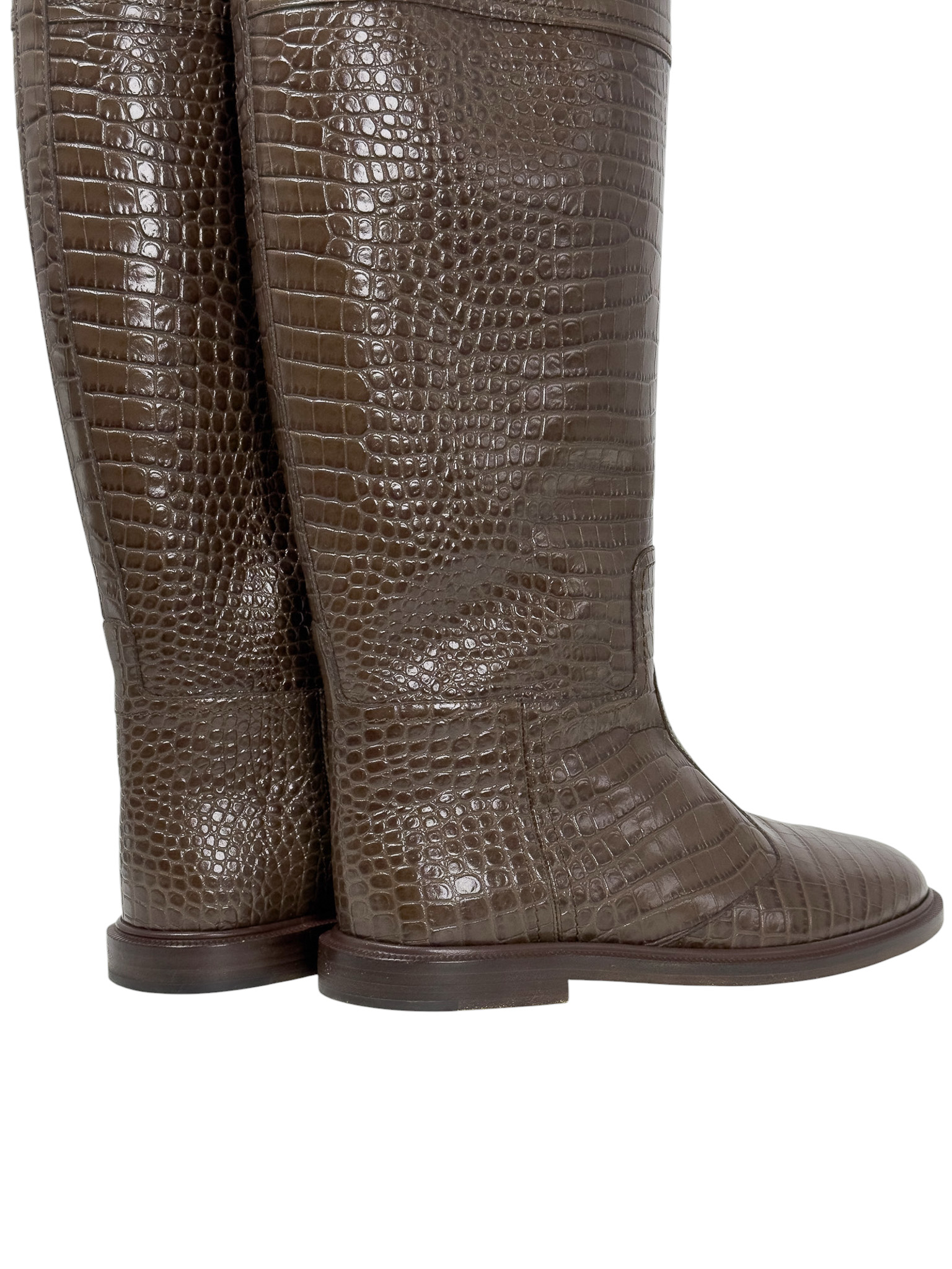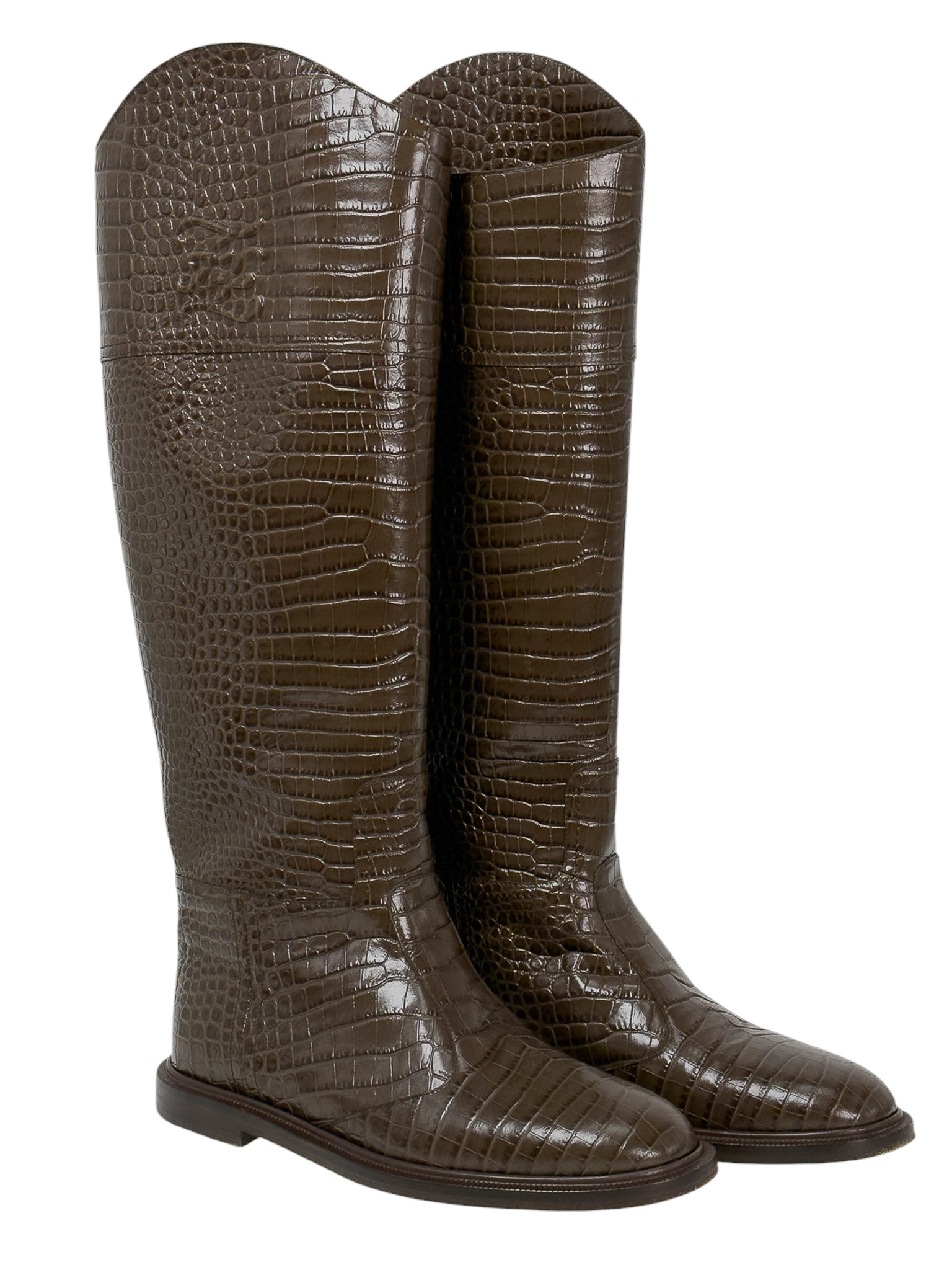 "Płaskie, brązowe kozaki z krokodyla, asymetryczna cholewka, wsuwane, wytłaczane logo marki w bocznej części, migdałowe noski, niski obcas, wykończone przeszyciami. Stan bardzo dobry. Rozmiar 37."