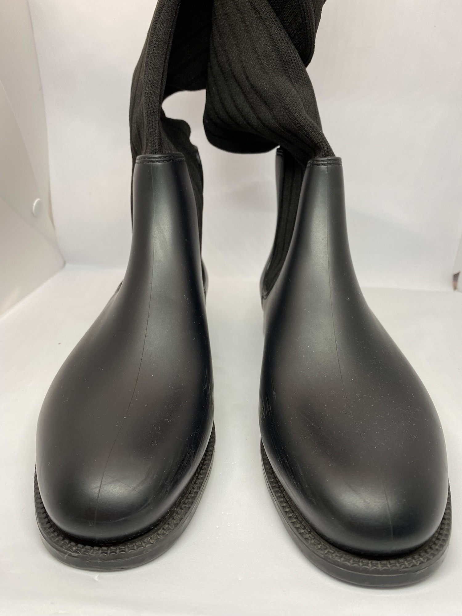 "czarne kozaki, długie, ponad kolano, stopa w formie kalosza, po całej długości materiałowe, jak skarpetka. Czarna z biało czerwonymi paskami oraz gwiazdkami. Rozmiar 39. Stan bardzo dobry."