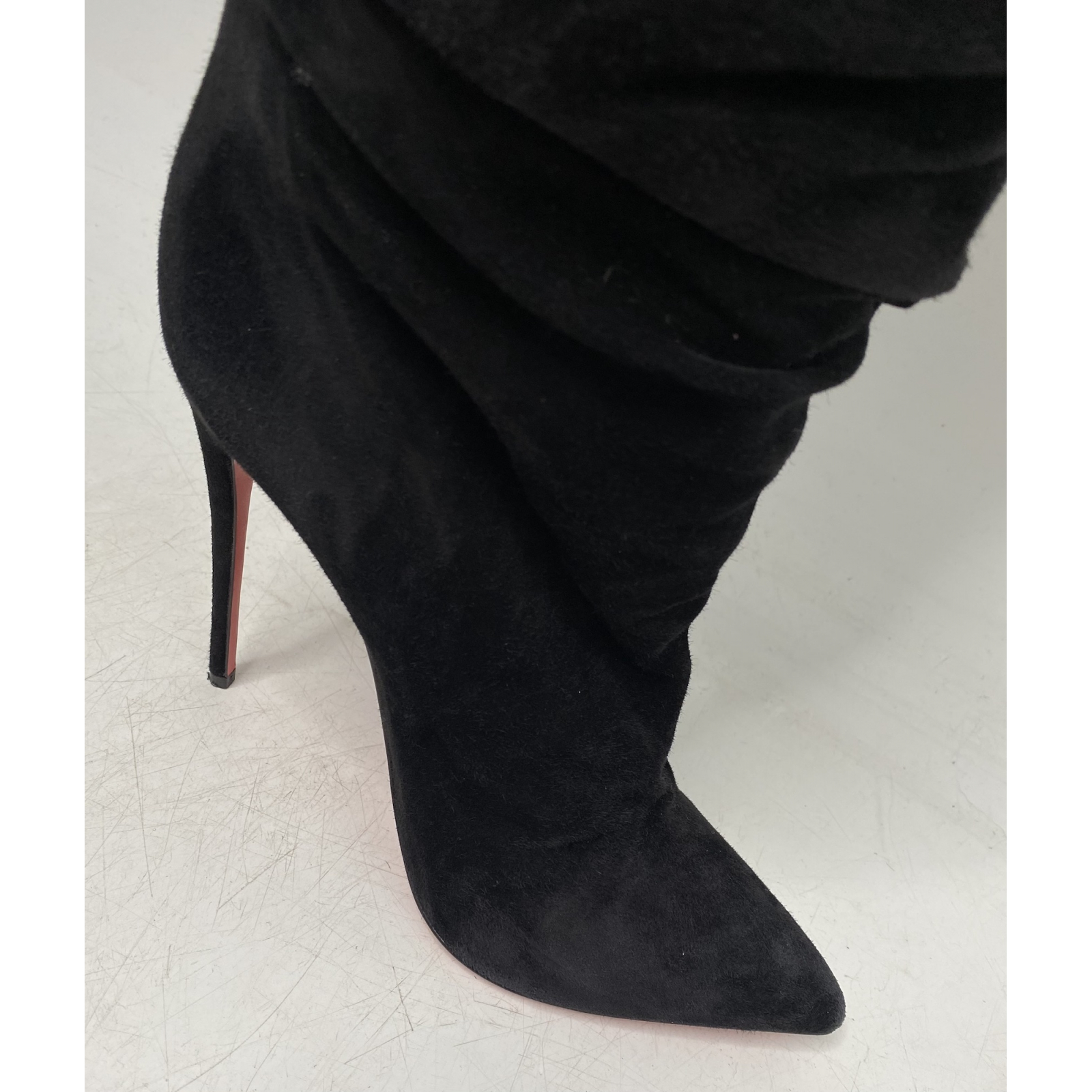 "czarne, zamszowe kozaki w szpic na szpilce 12 cm, marszczona, długa cholewka, stan idealny, rozmiar 38,5, worki przeciwkurzowe"