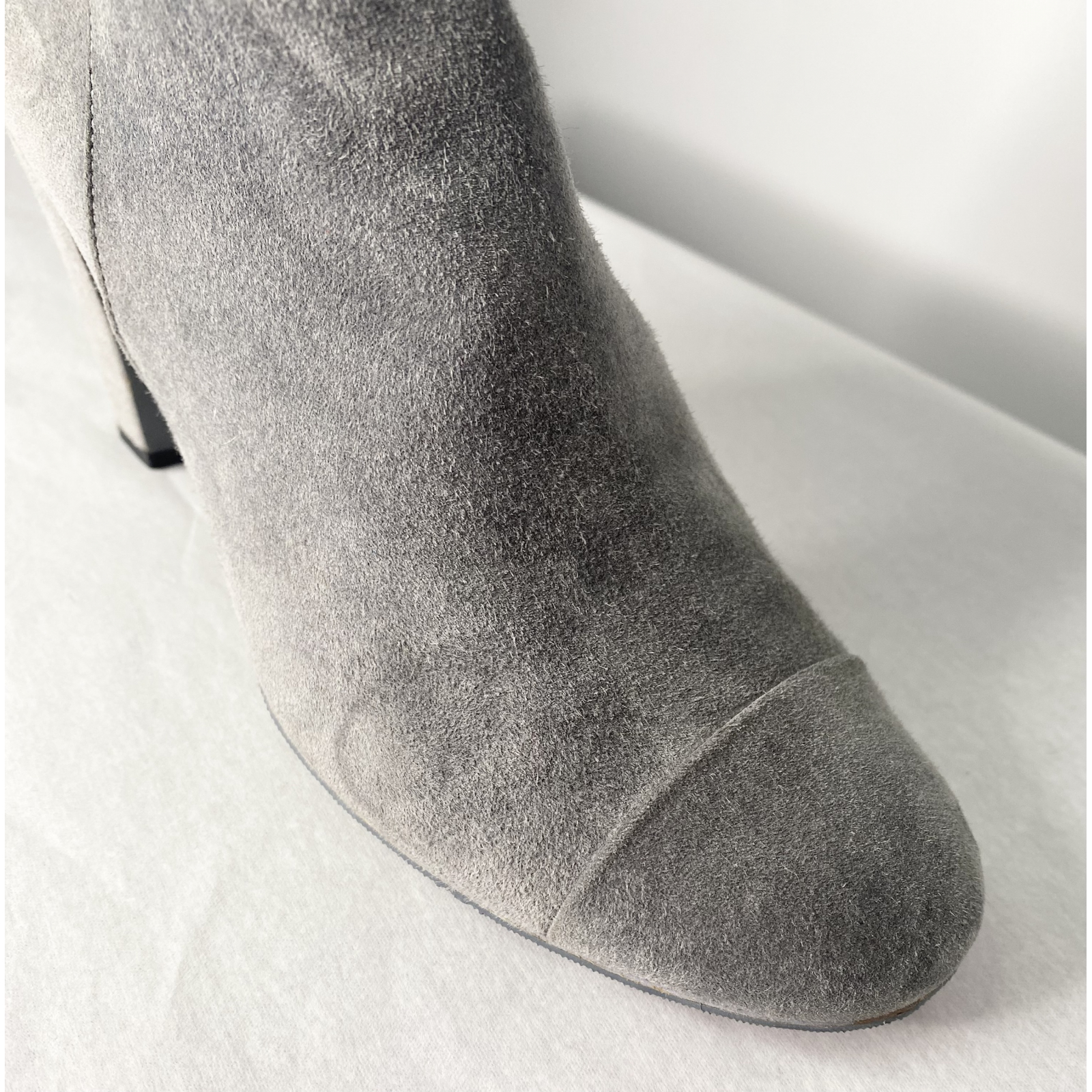 "kozaki długie jasnoszare, skóra zamszowa, obcas słupek (7,5 cm), górna część cholewki ozdobiona logo, widoczne przybrudzenia na skórze."