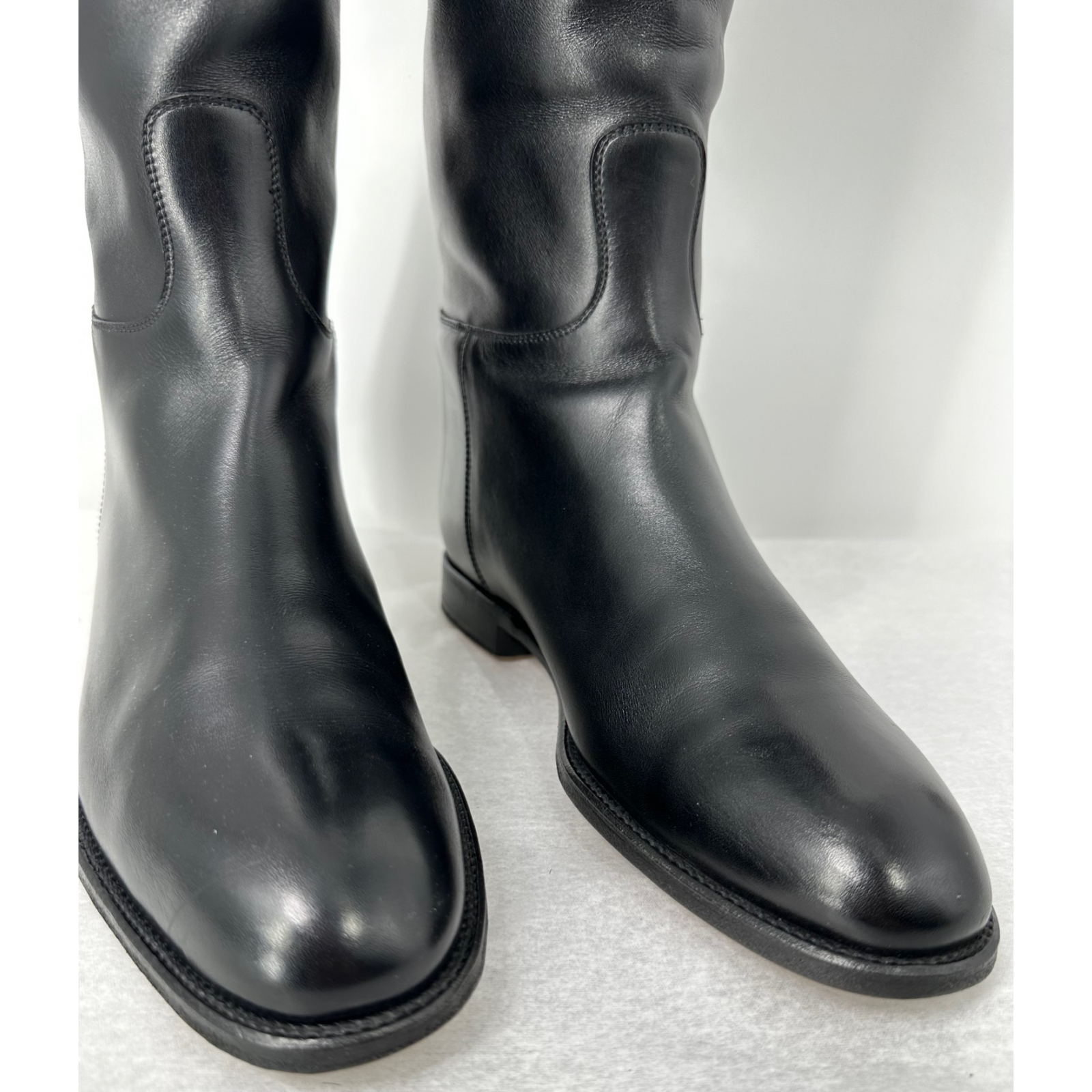 "czarne skórzane kozaki, przy cholewce skórzany pasek ze srebrną klamrą, używane, widoczne rysy na skórze oraz przetarcia na podeszwie, pudełko w zestawie. Rozmiar 38,5."