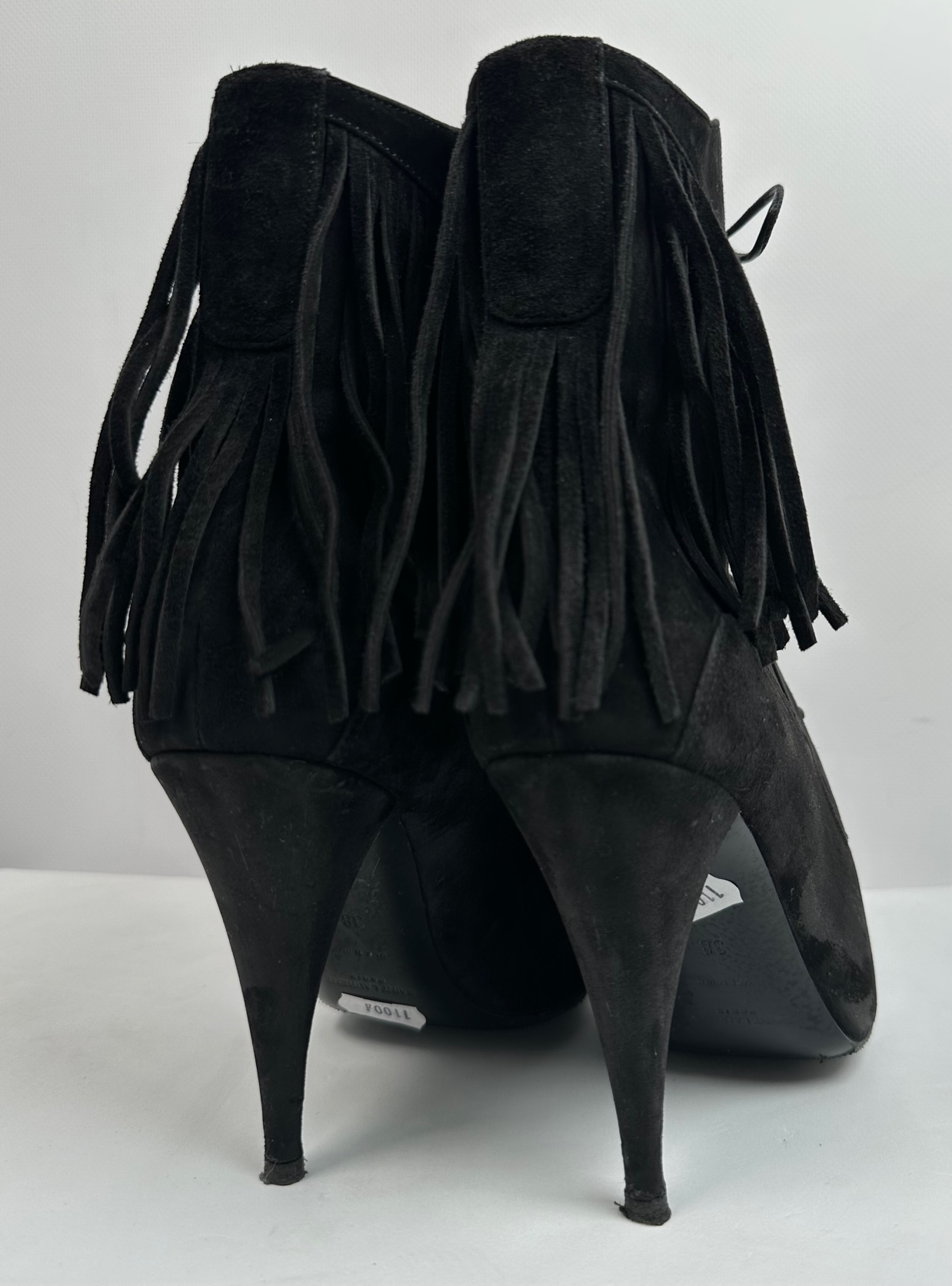 "Botki czarne z frędzlami, na obcasie, zamszowe. Używane. Pudełko w komplecie. Rozmiar 38."