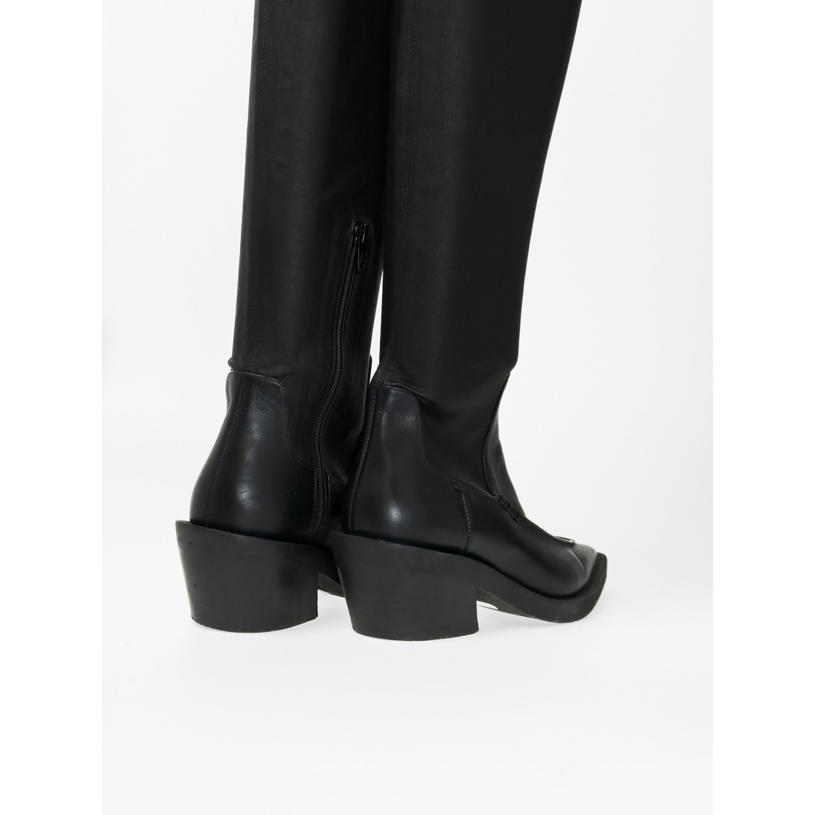 "Czarne skórzane kozaki, wysoka dopasowana cholewka, za kolana, nosek w szpic, miękka skóra, zakrzywiony obcas, zapinane na częściowy suwak od wewnętrznej strony, wykończone przeszyciami, używane. Stan dobry, przetarcia oraz zadrapania na skórze i podeszwie. Rozmiar 37."