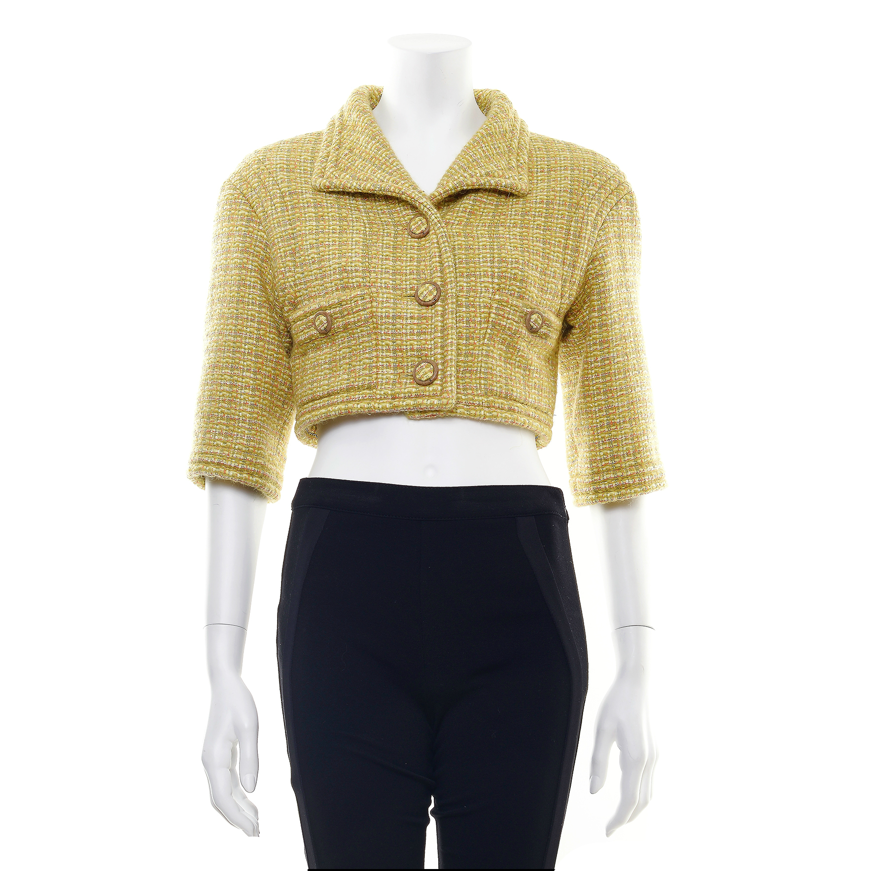 "Krótki tweedowy żakiet w kolorze żółtym. Zapinany na guziki , rozmiar 34. Wymiary: ramiona 40 cm, biust 43 cm, długość rękawa 37 cm, długość całkowita 43 cm."