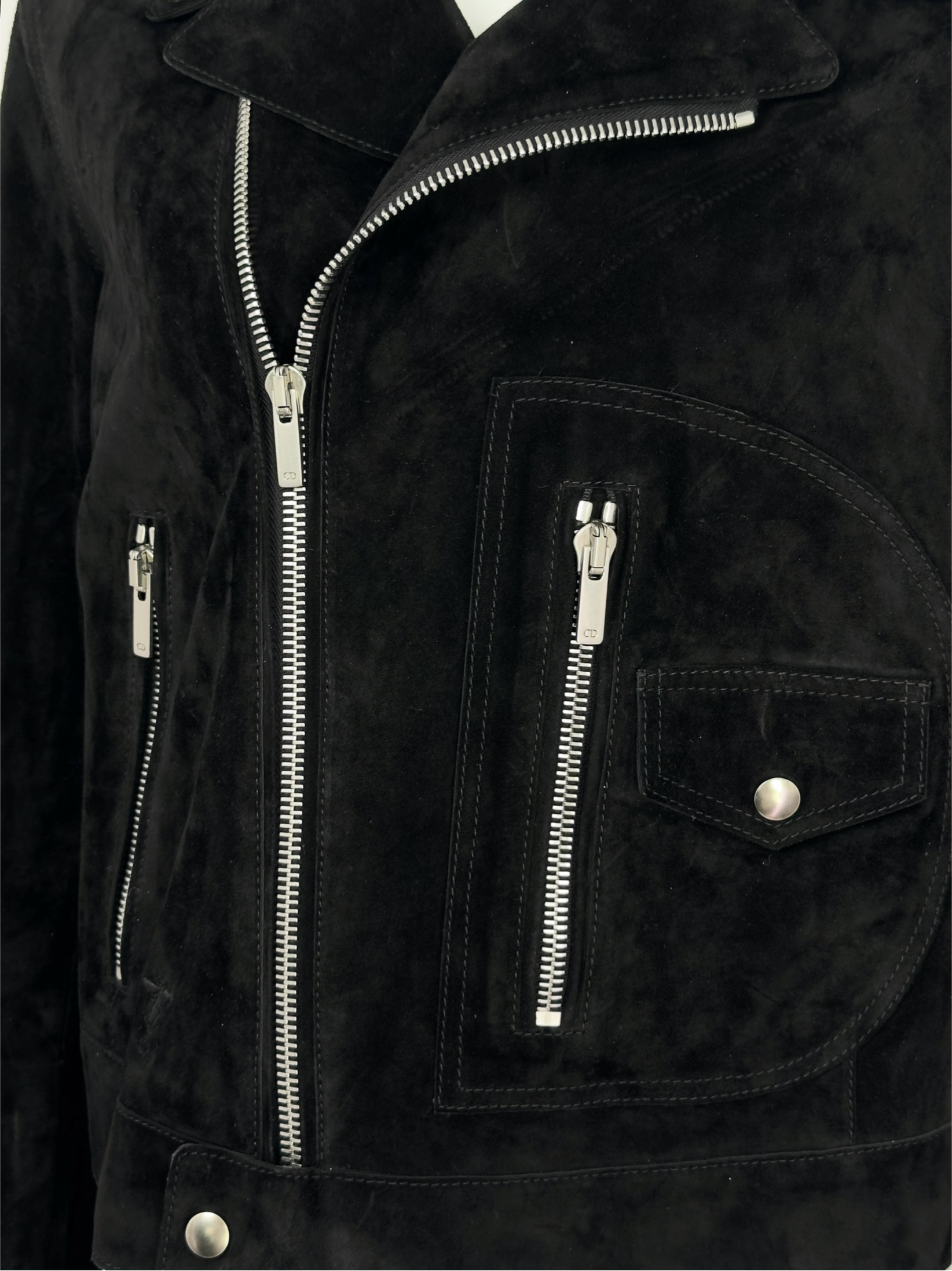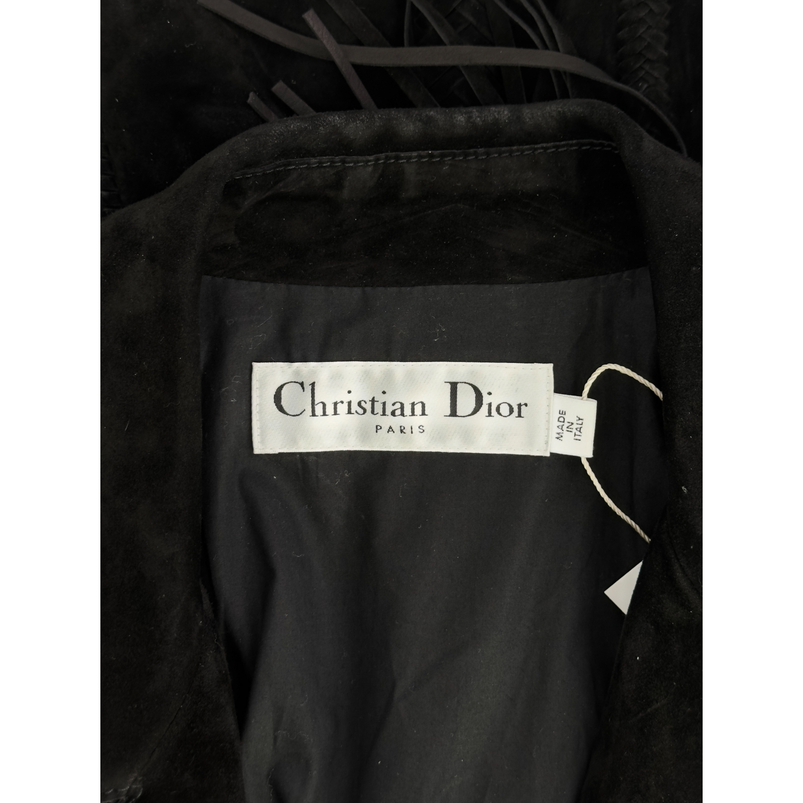 "Czarna kurtka zamszowa w stylu motocyklowym, krótka, zapinana na dwa logowane suwaki, trzy kieszenie po bokach, patki na ramionach, pleciona grafika na plecach w kształcie palm, zwierząt oraz motyla wykończona frędzlami, srebrne okucia, wyszyte logo marki z owadem na przodzie, kołnierzyk. Rozmiar z metki IT 44. Skład: 100% skóra cielęca; podszewka: 100% bawełna. Wymiary: szerokość mierzona od pachy do pachy 49cm, długość całkowita 54cm."